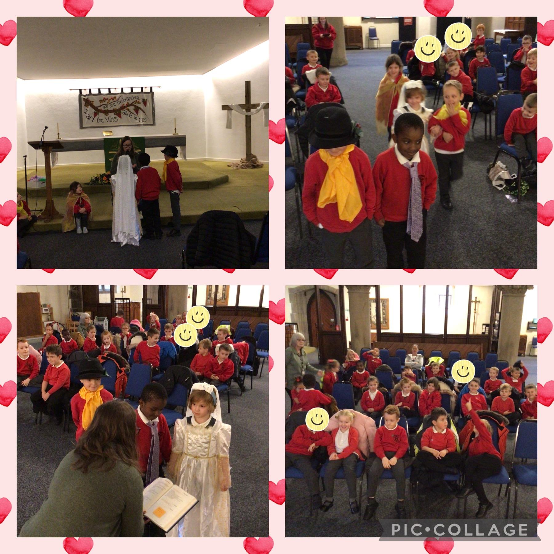 In RE we have been learning about how different communities show love and care for one another. We walked to Bramley St Peter's church and Pastor Julia performed a "mock" wedding. She talked to us about the meaning of the vows and rings in a traditional Christian wedding.