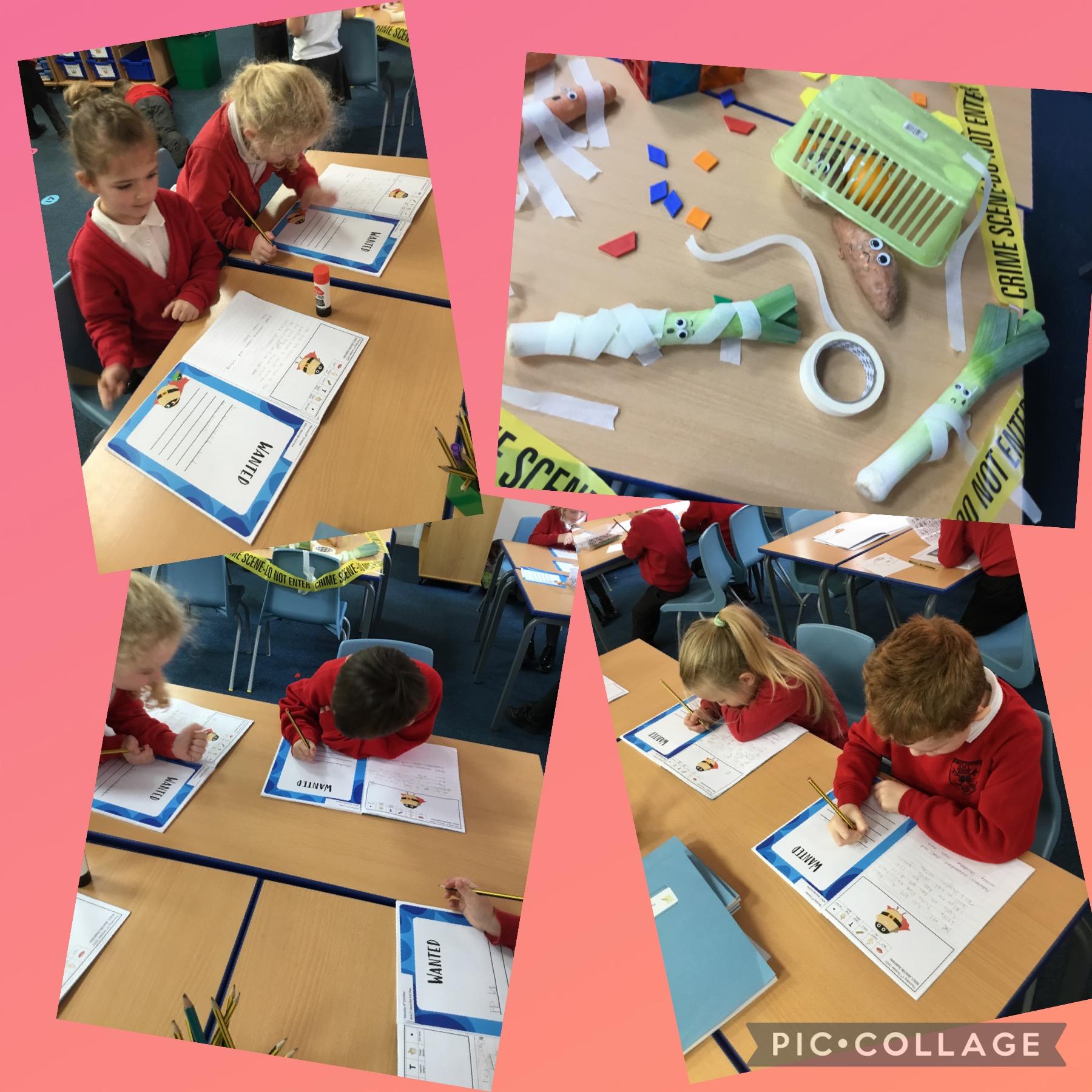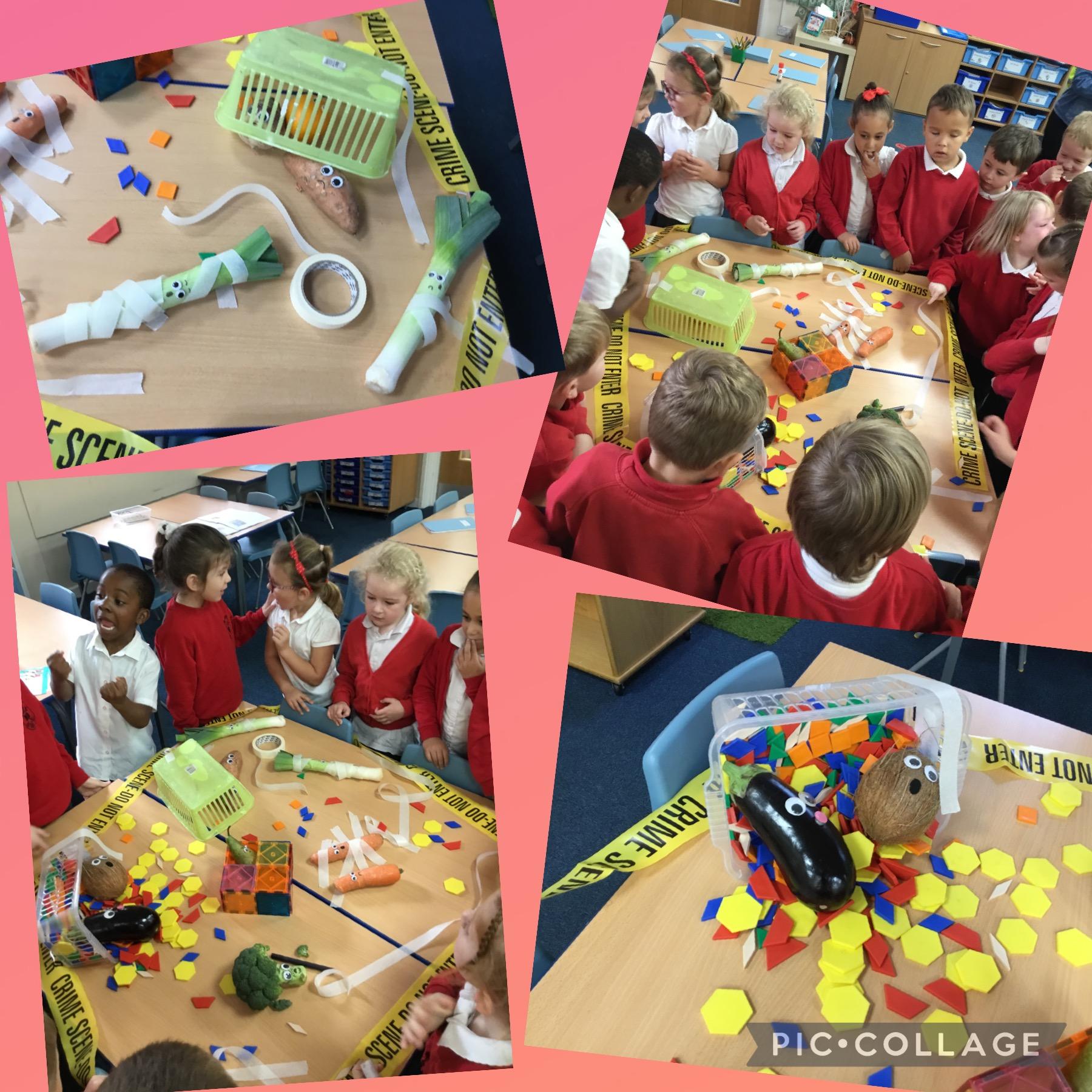Today it was very exciting in 1PC as the children stumbled across a vegetable crime scene. They took on the role of detectives and created wanted posters to try to discover the hiding place of Evil Pea. The search continues!