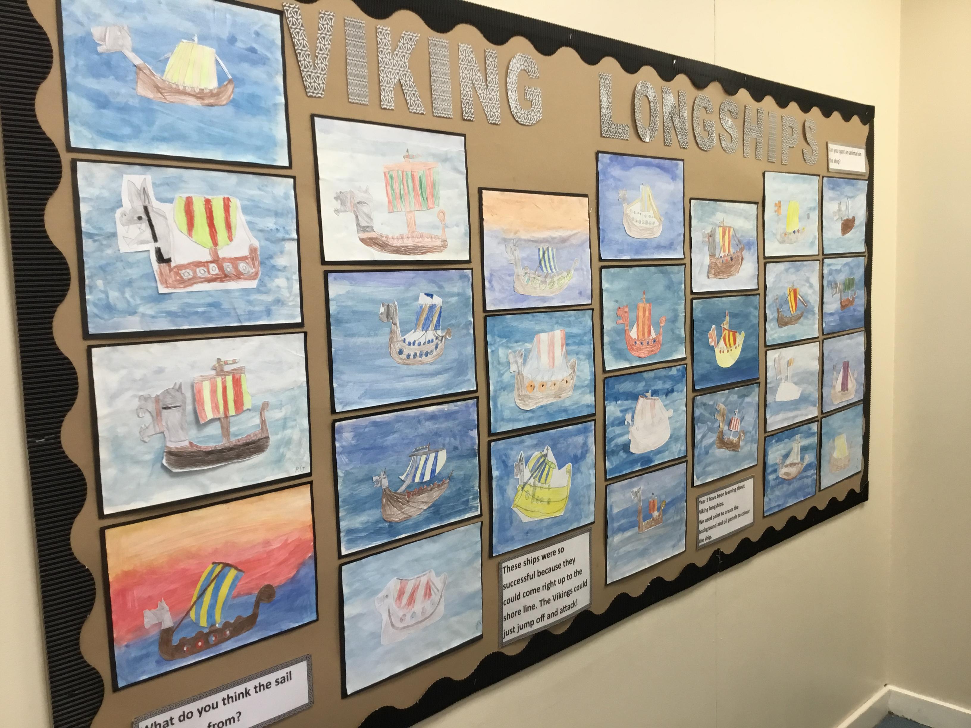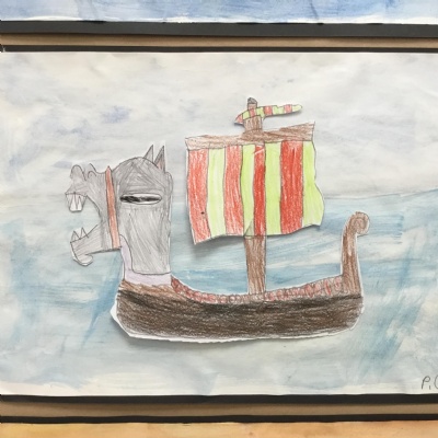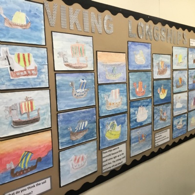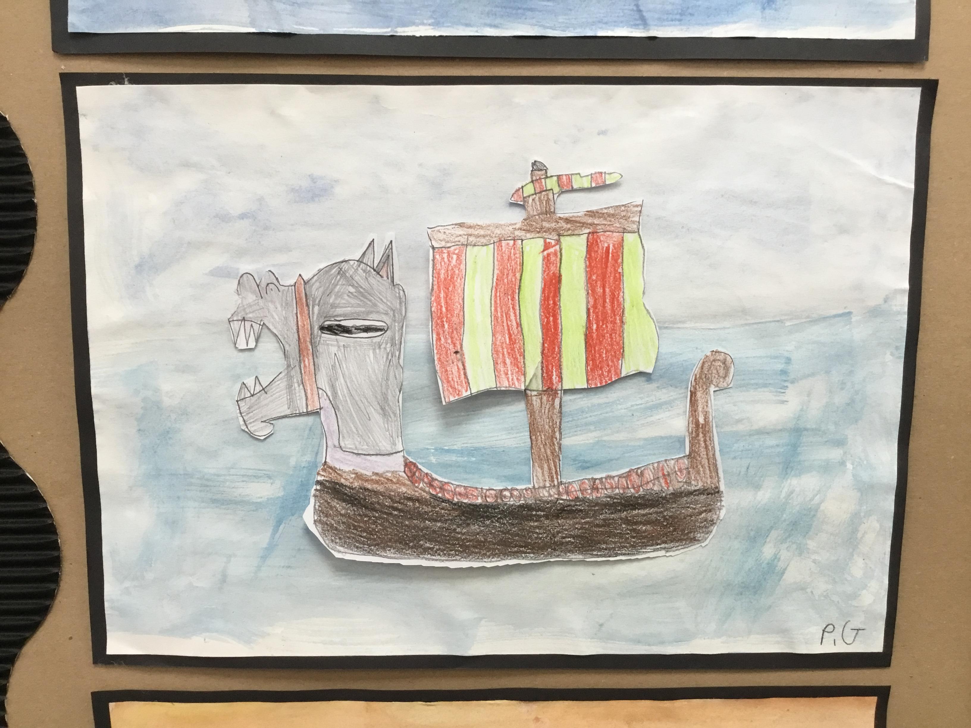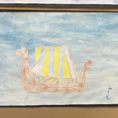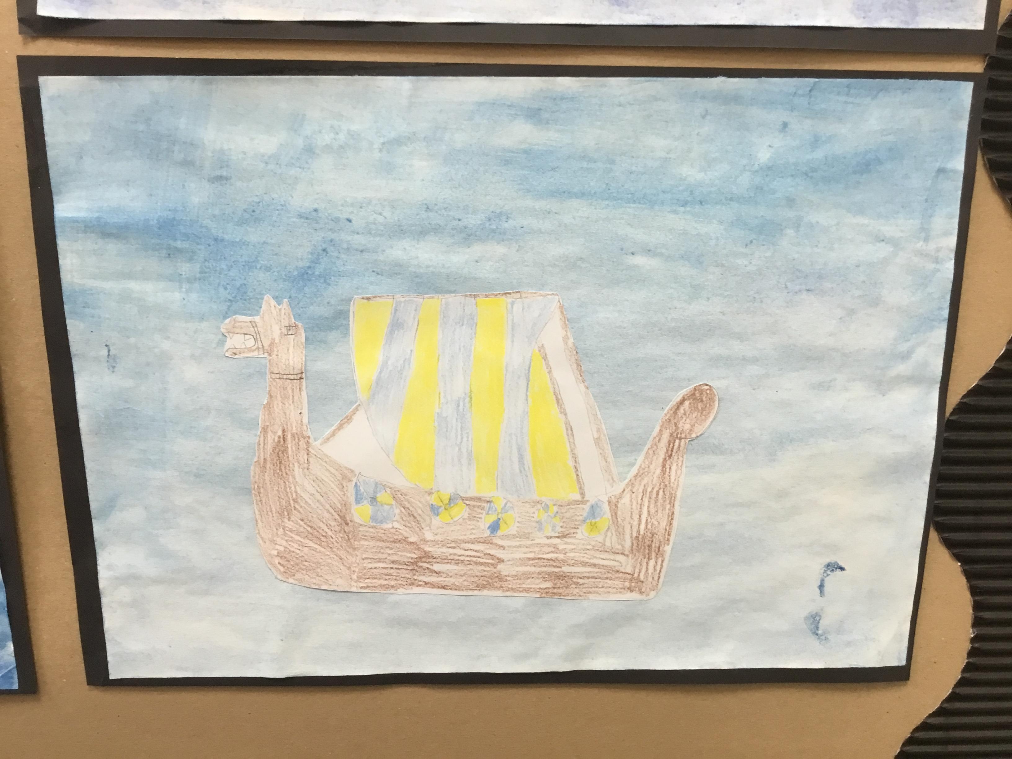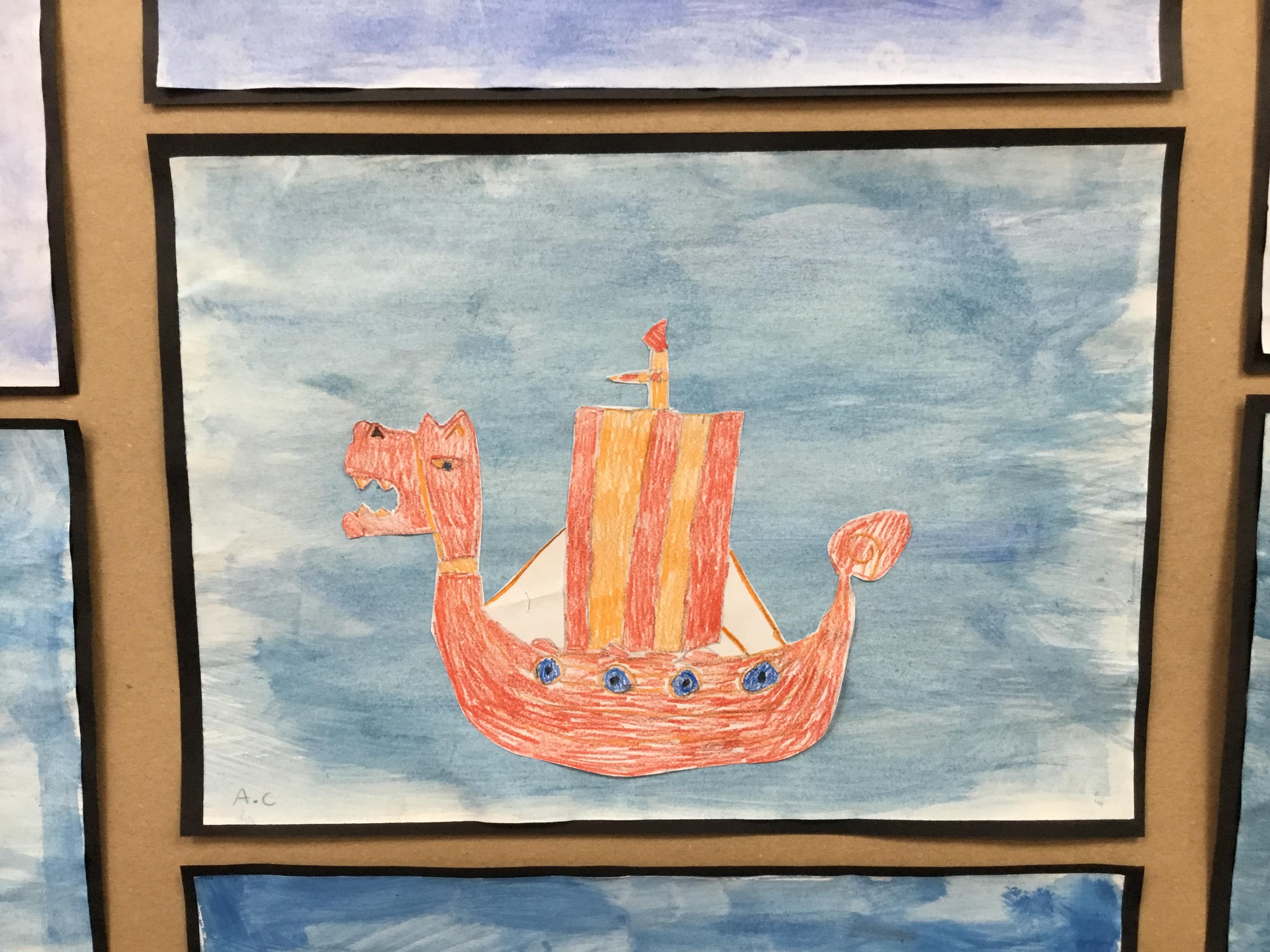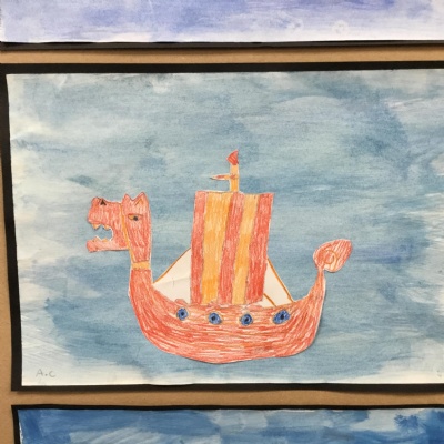 During our first week in Year 5, we used water colours to create a background and practised our drawing skills to create our Viking Longships pictures, have a look at some of our examples below.