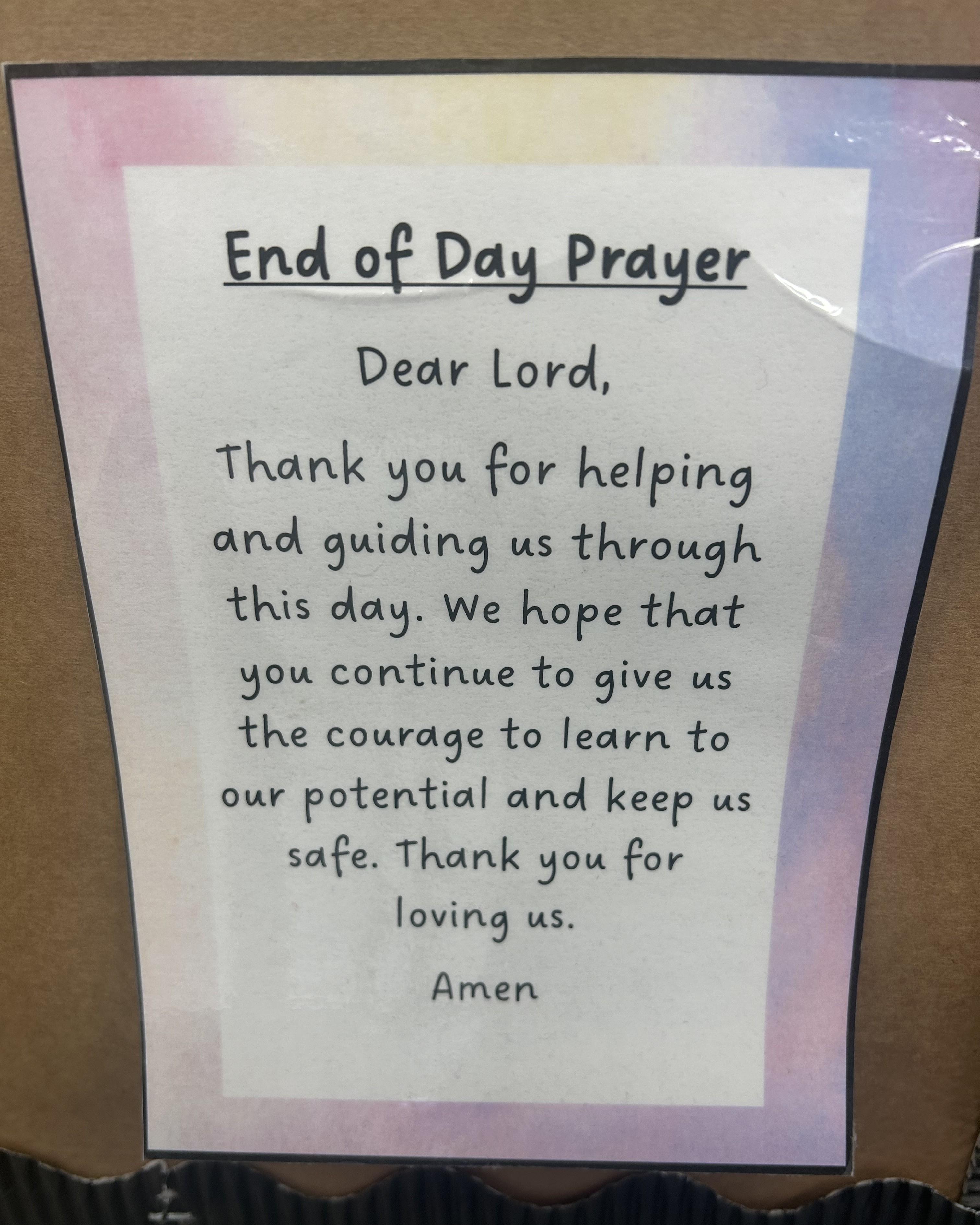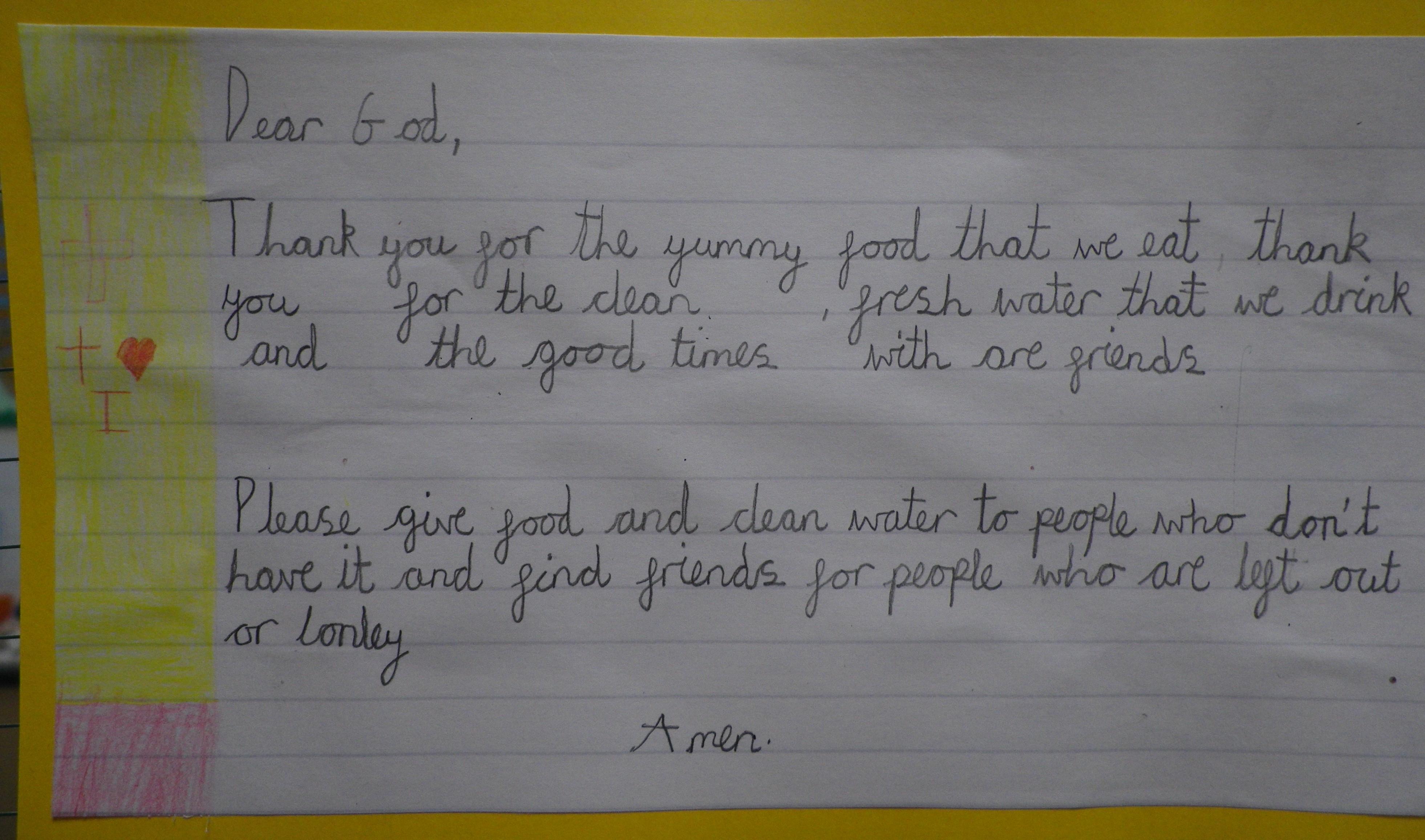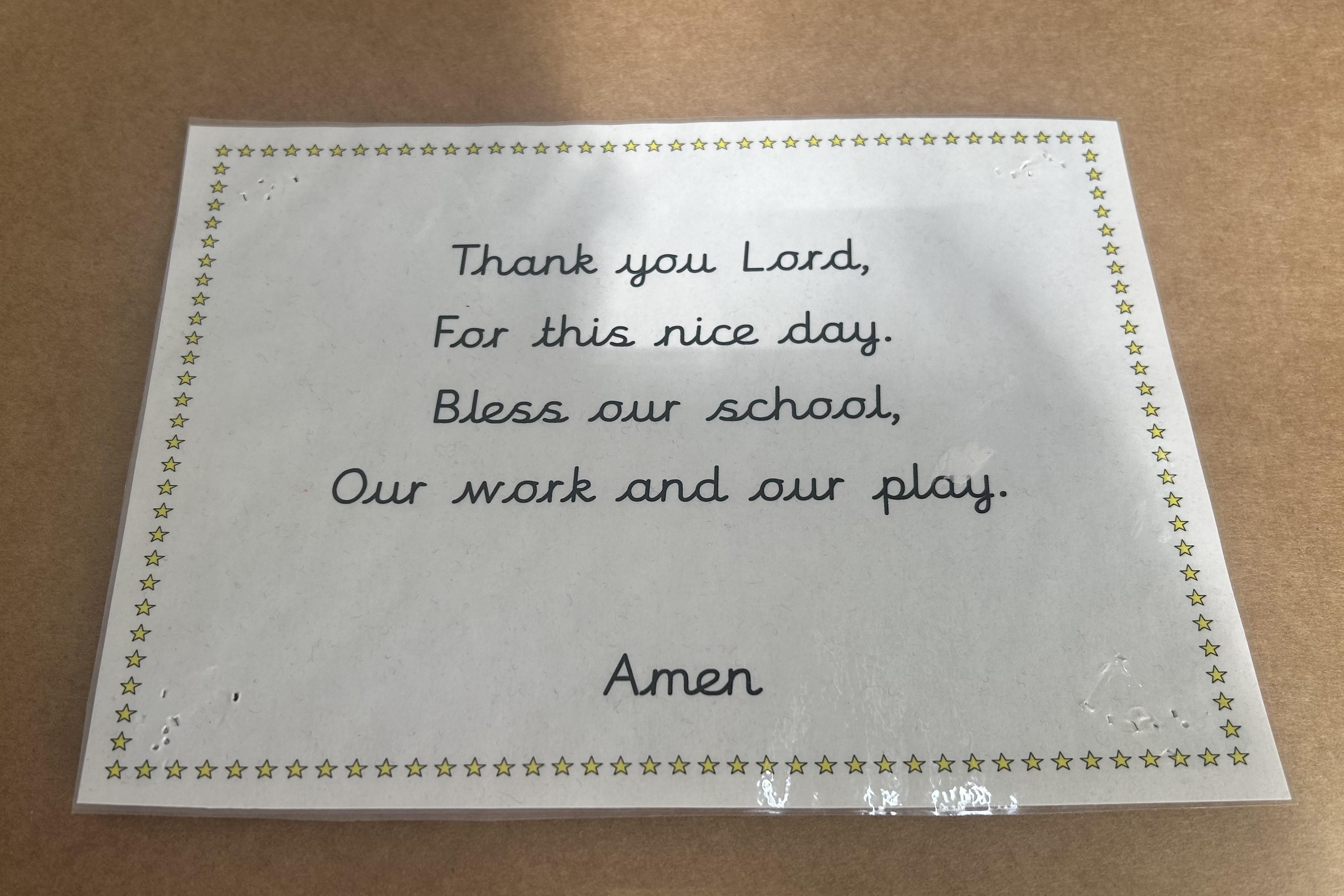 Prayer plays an integral role within the school. The school prayer has been written by past pupils and is displayed in every classroom. This complements the thanksgiving prayers said before lunch and at the end of the school day. Prayer is always invitational and children choose how to respond to 'Let us pray'.