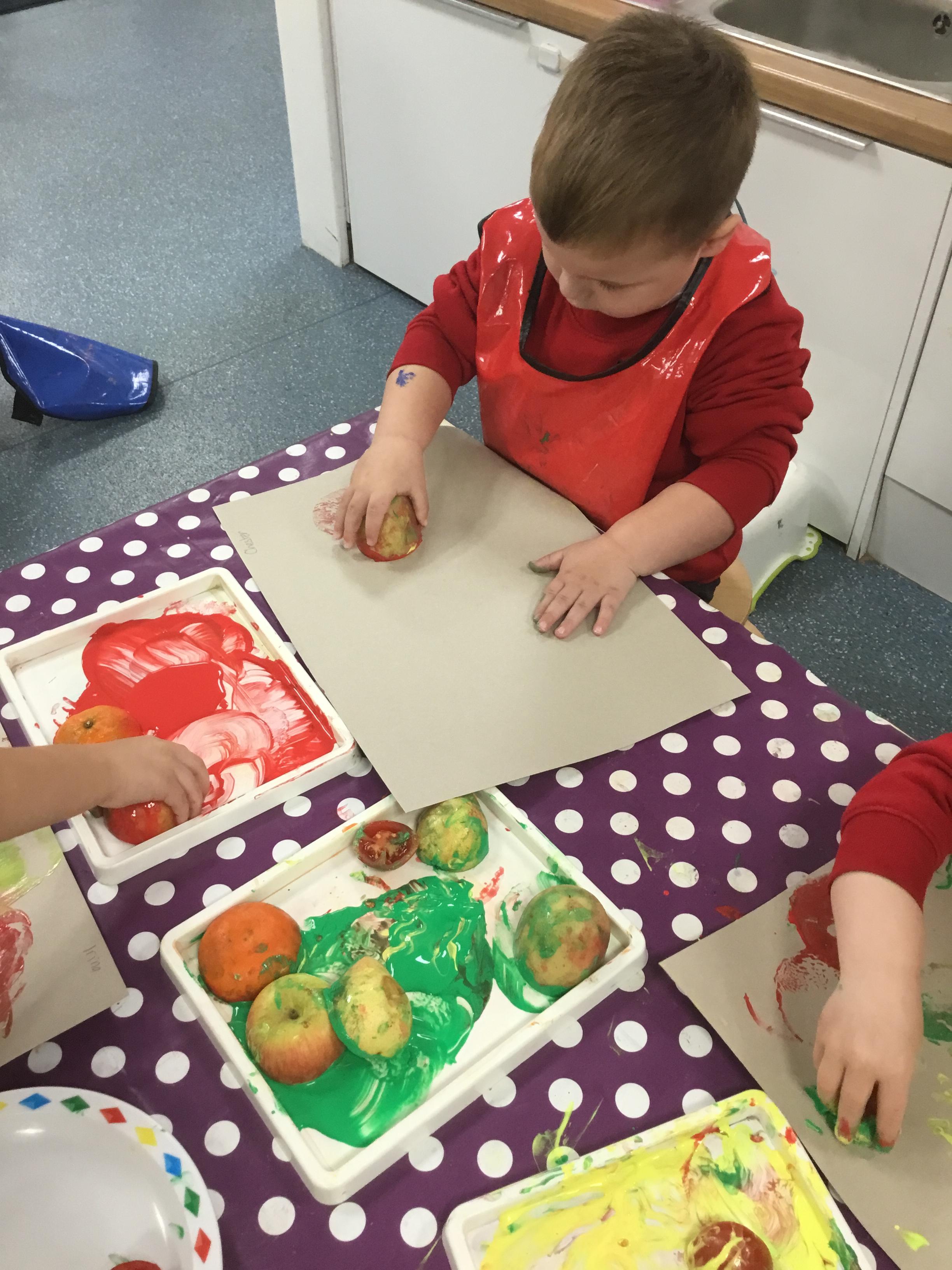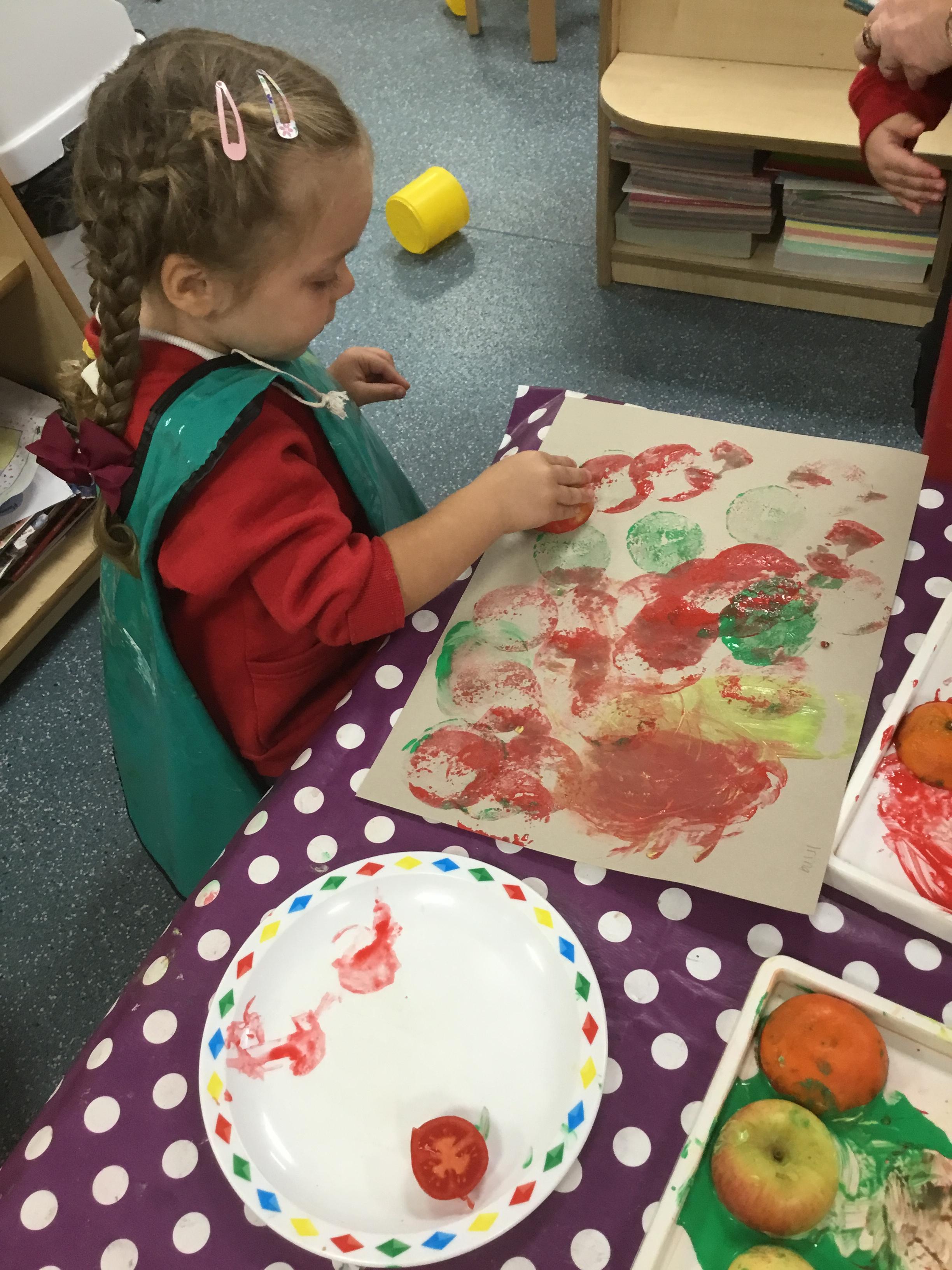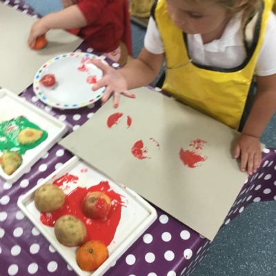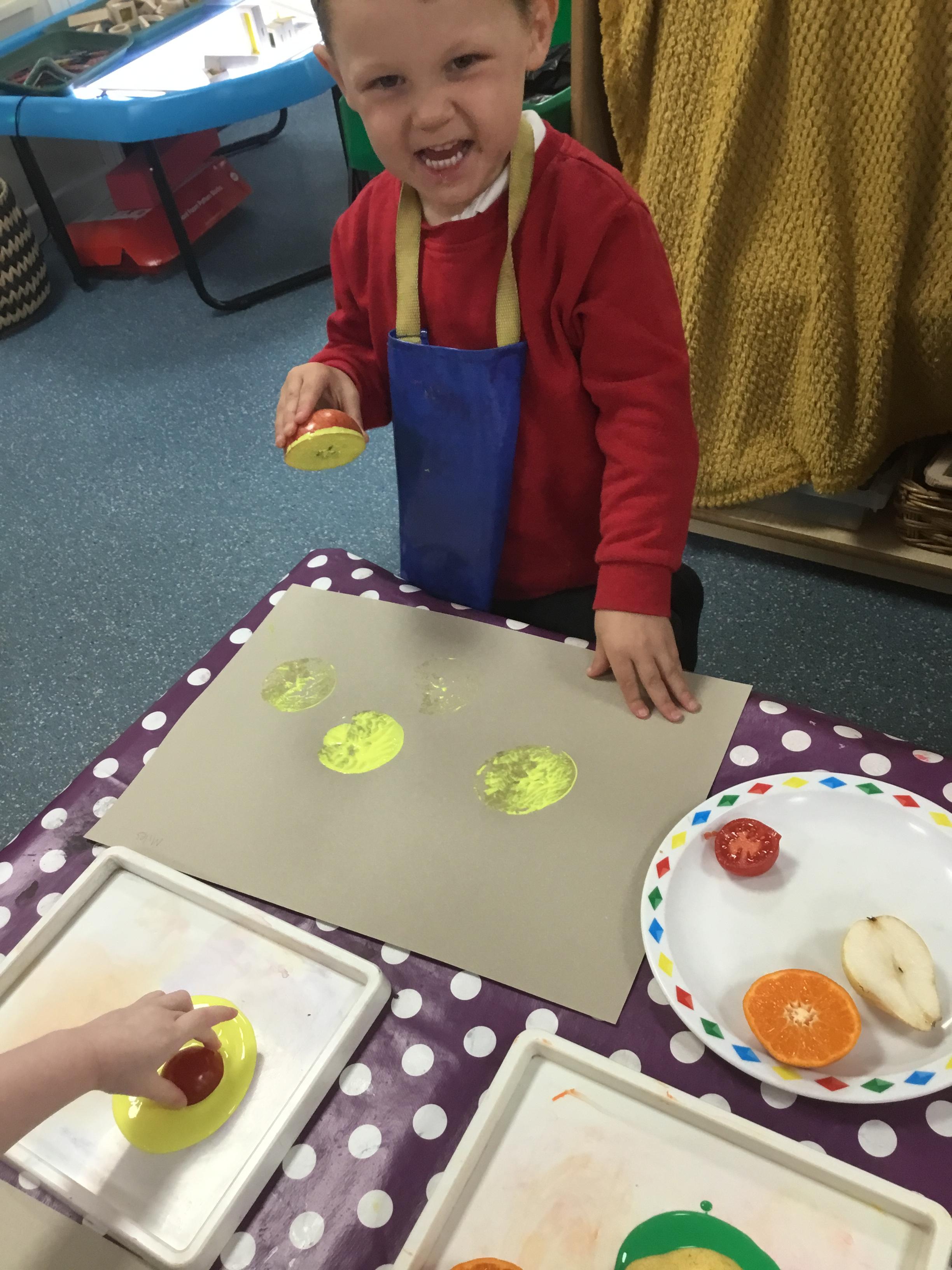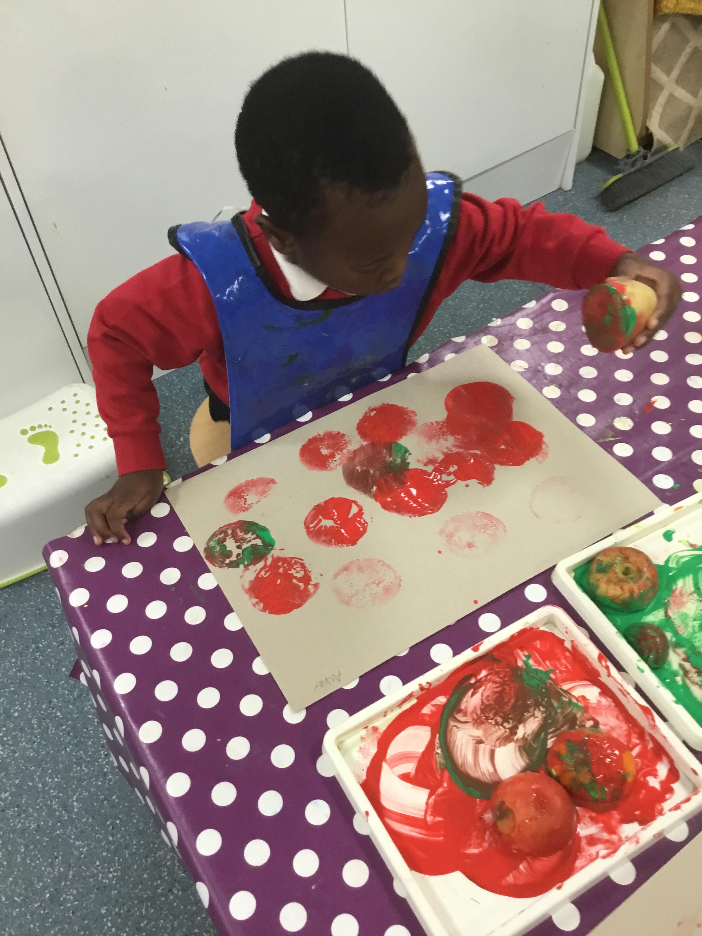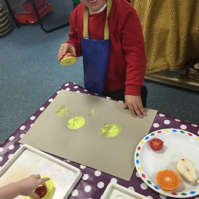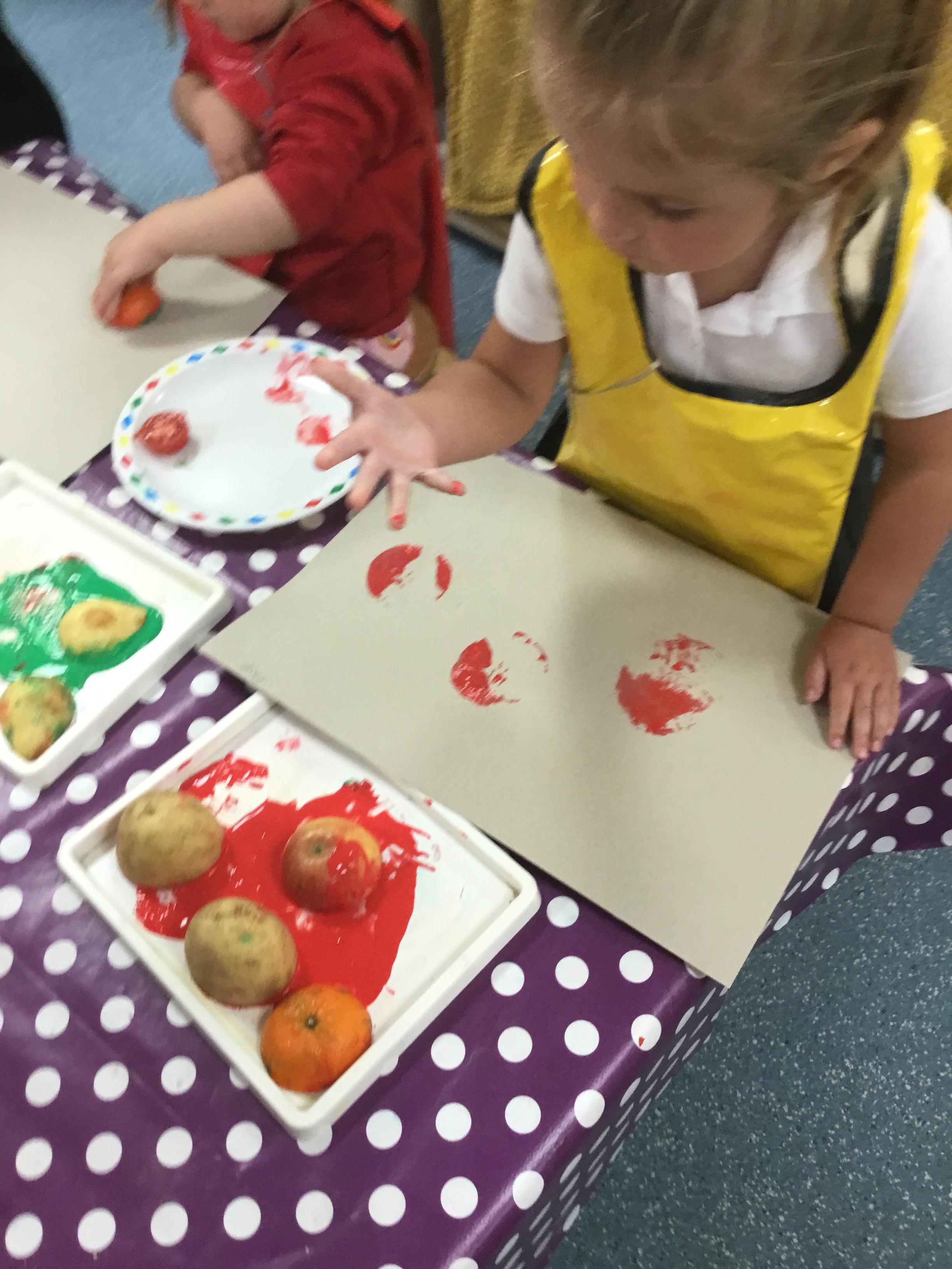 The children have been learning about ‘Harvest’ in Nursery and then they enjoyed printing pictures with some fruits and vegetables.