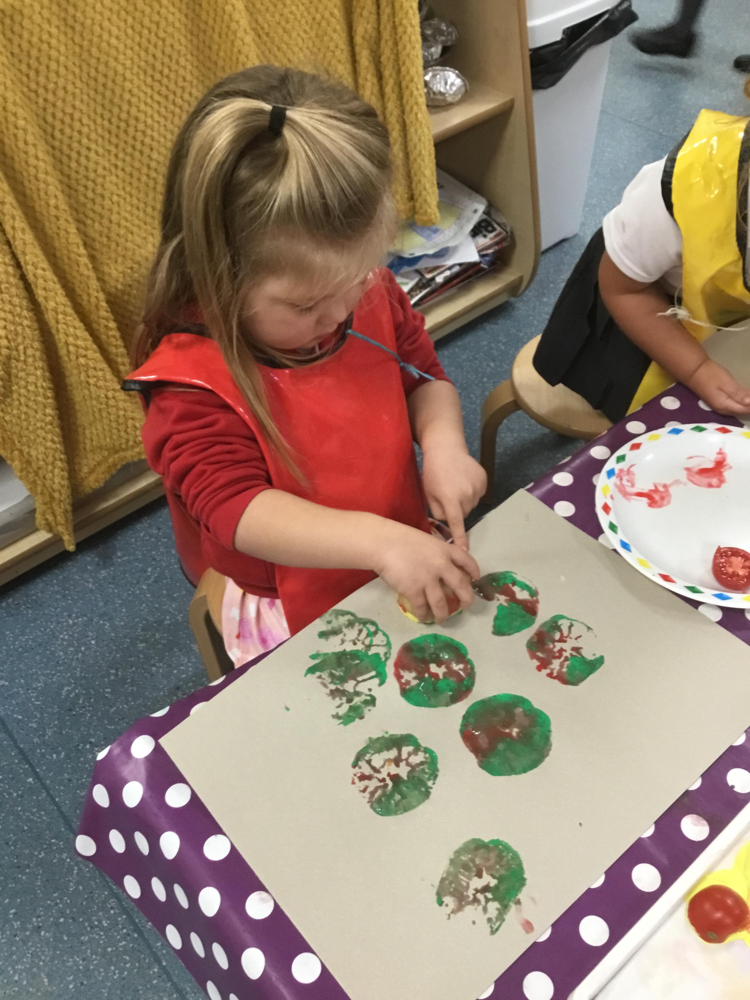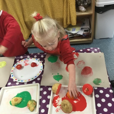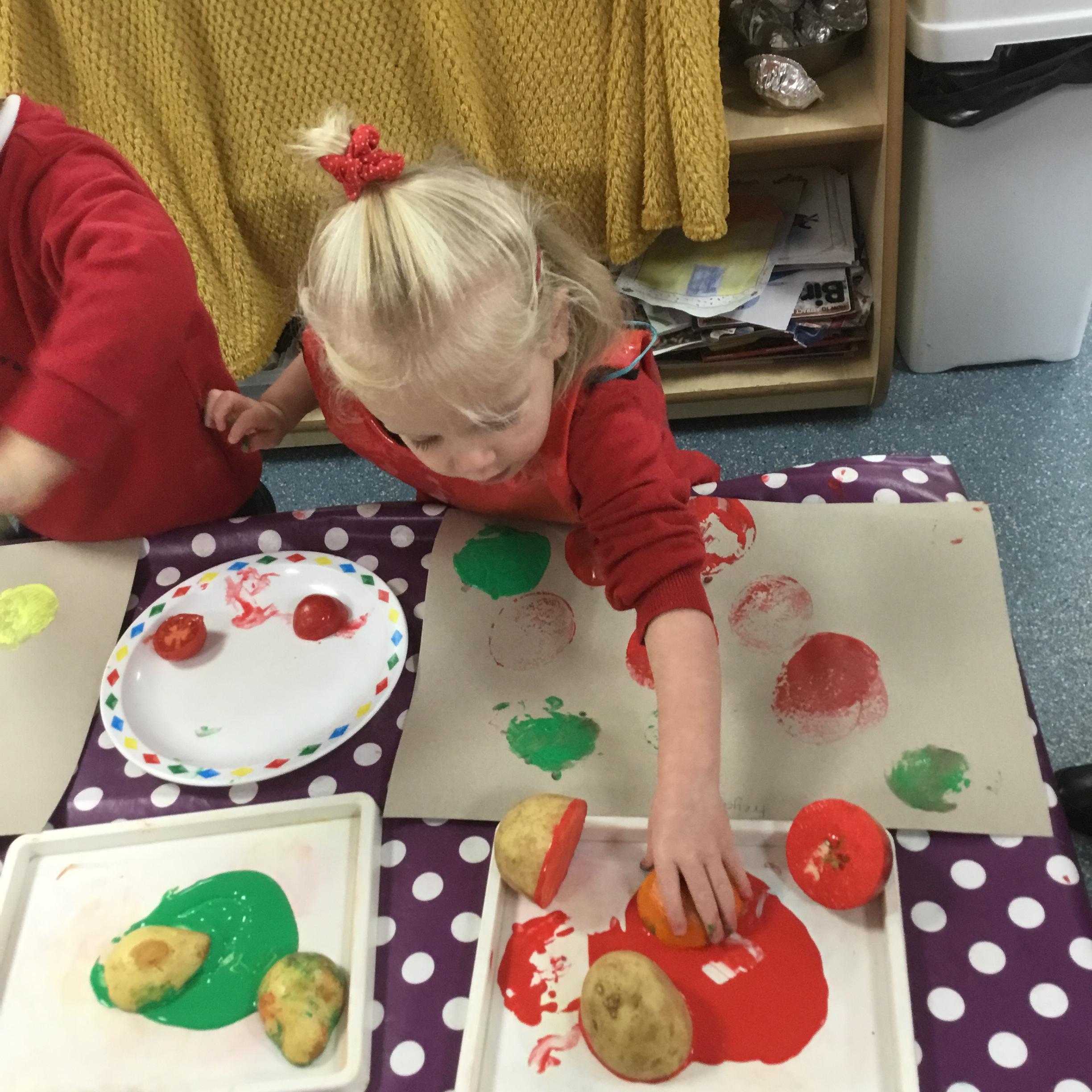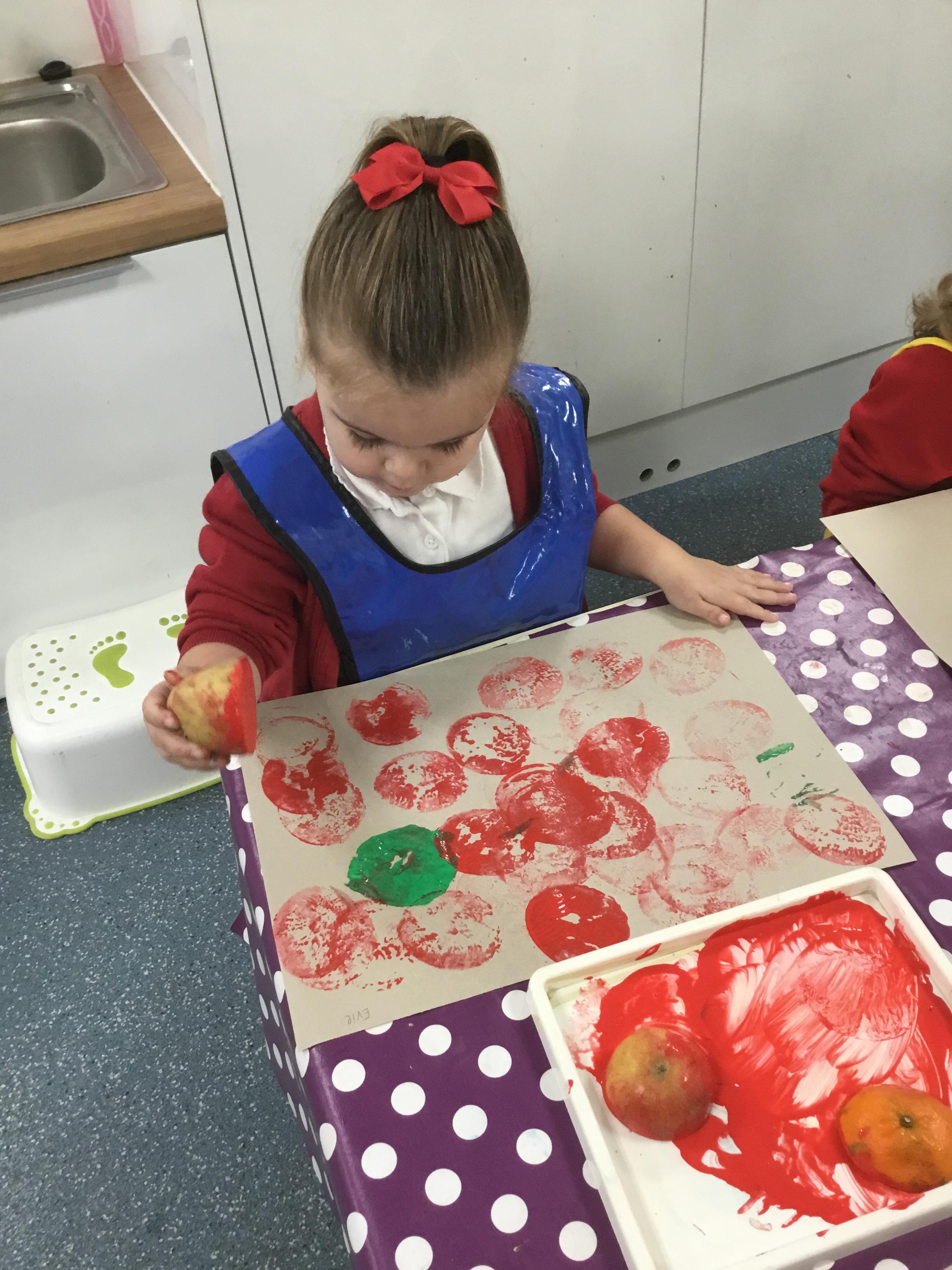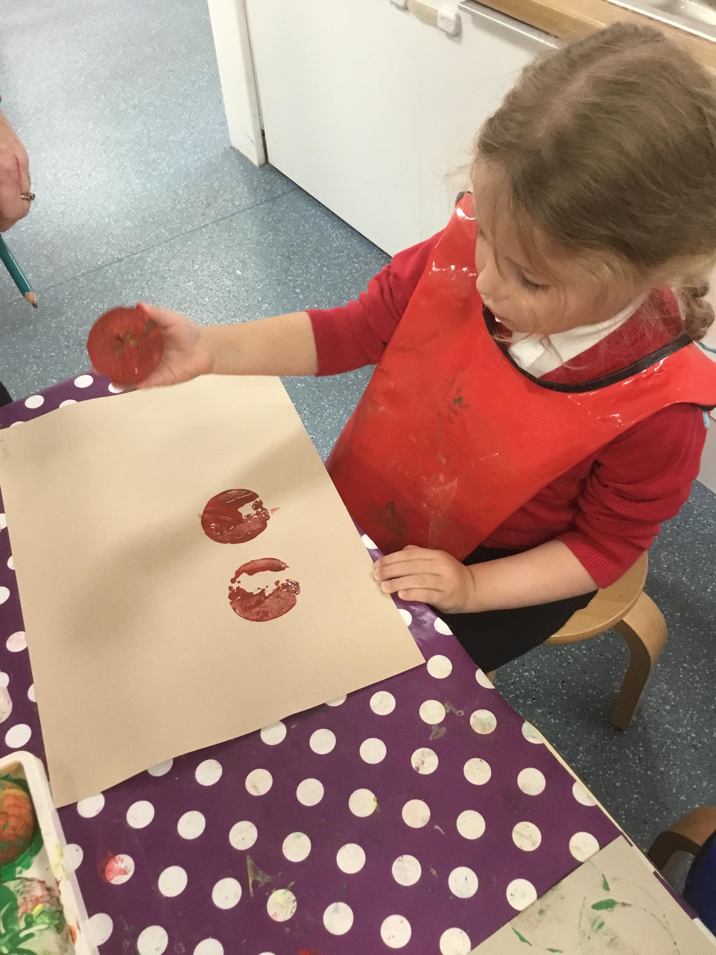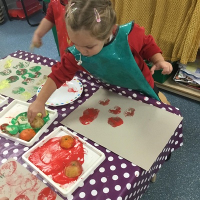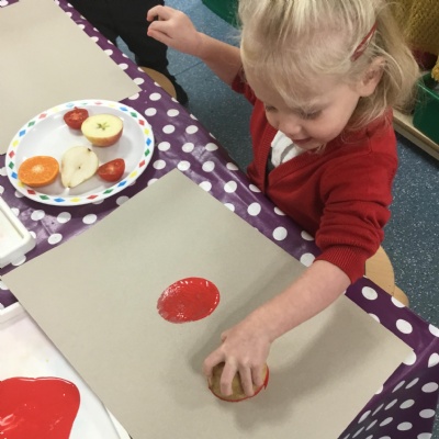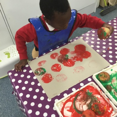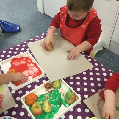 The children have been learning about ‘Harvest’ in Nursery and then they enjoyed printing pictures with some fruits and vegetables.