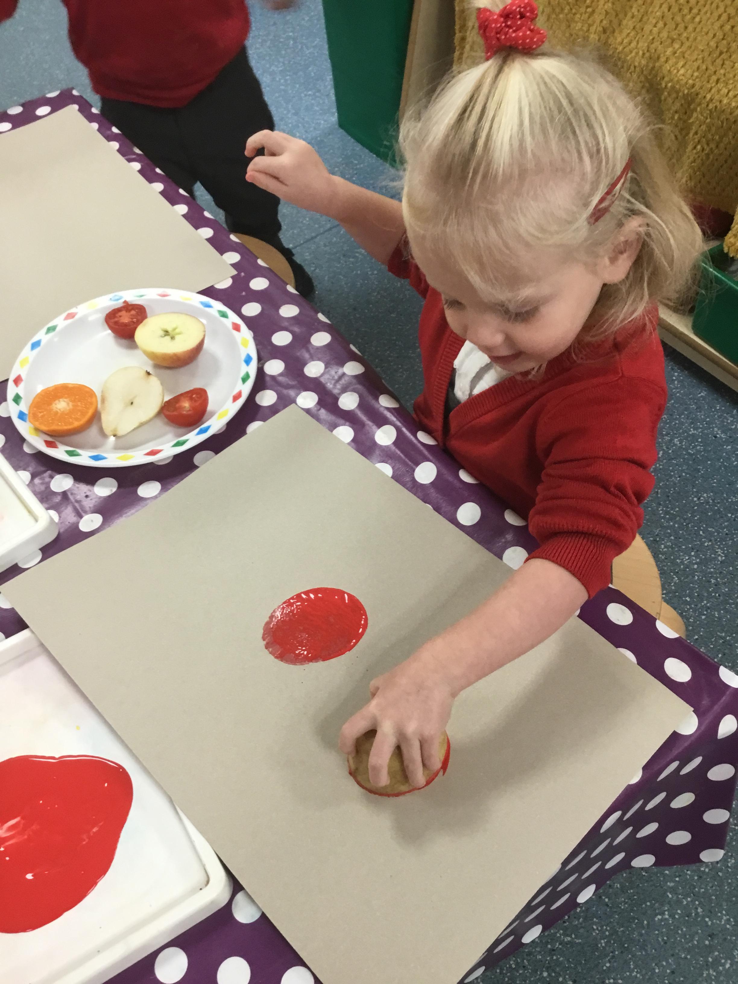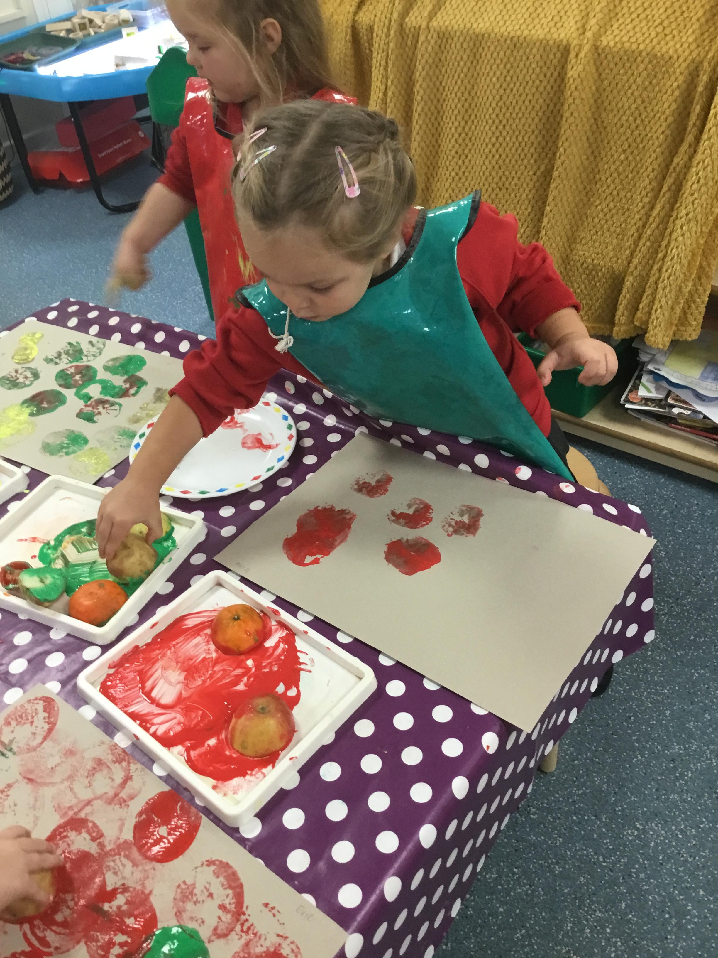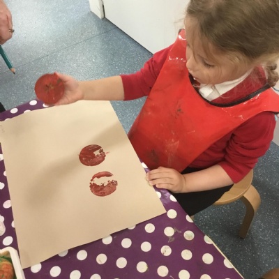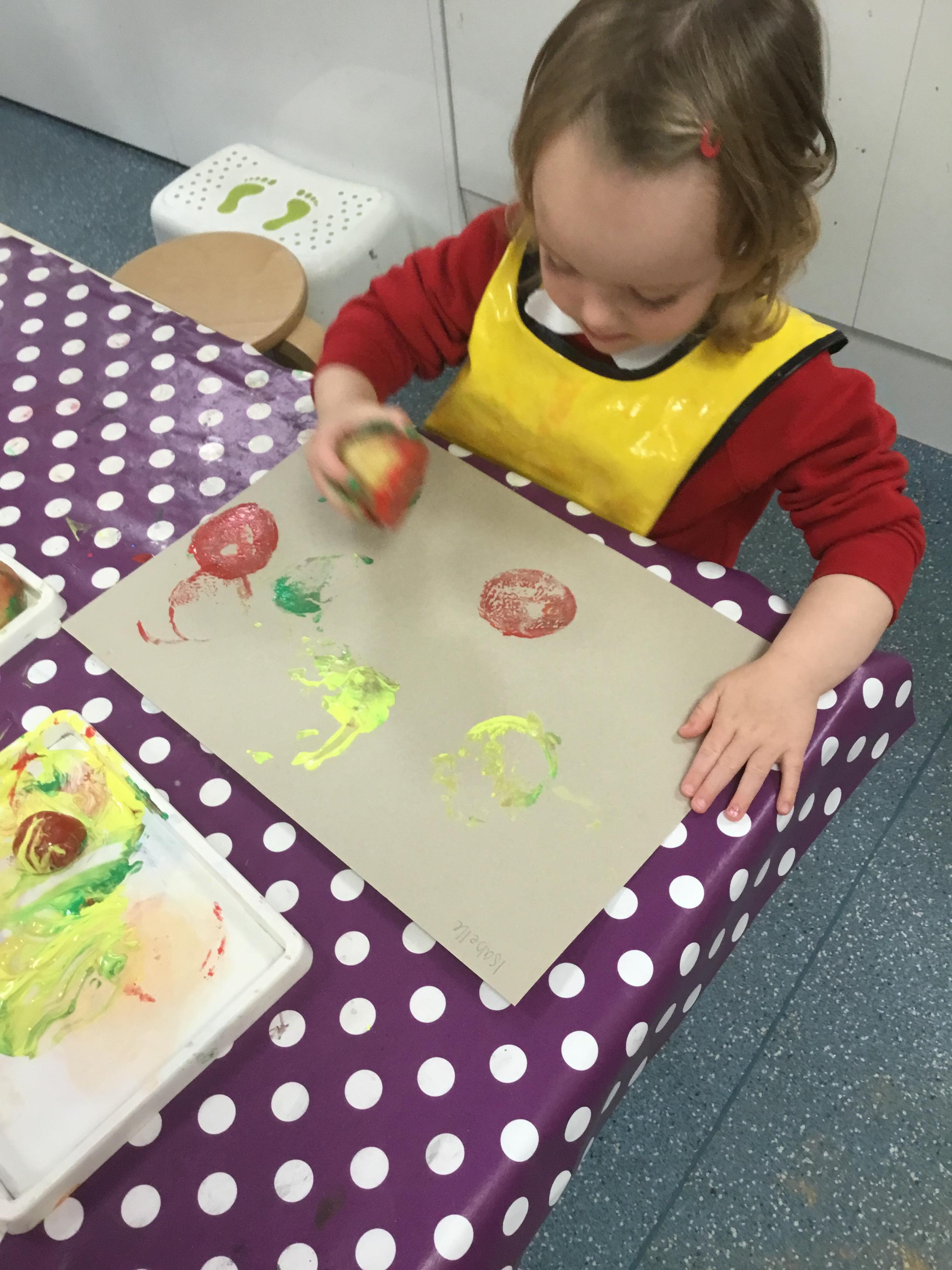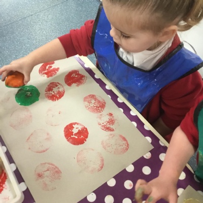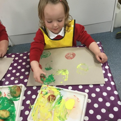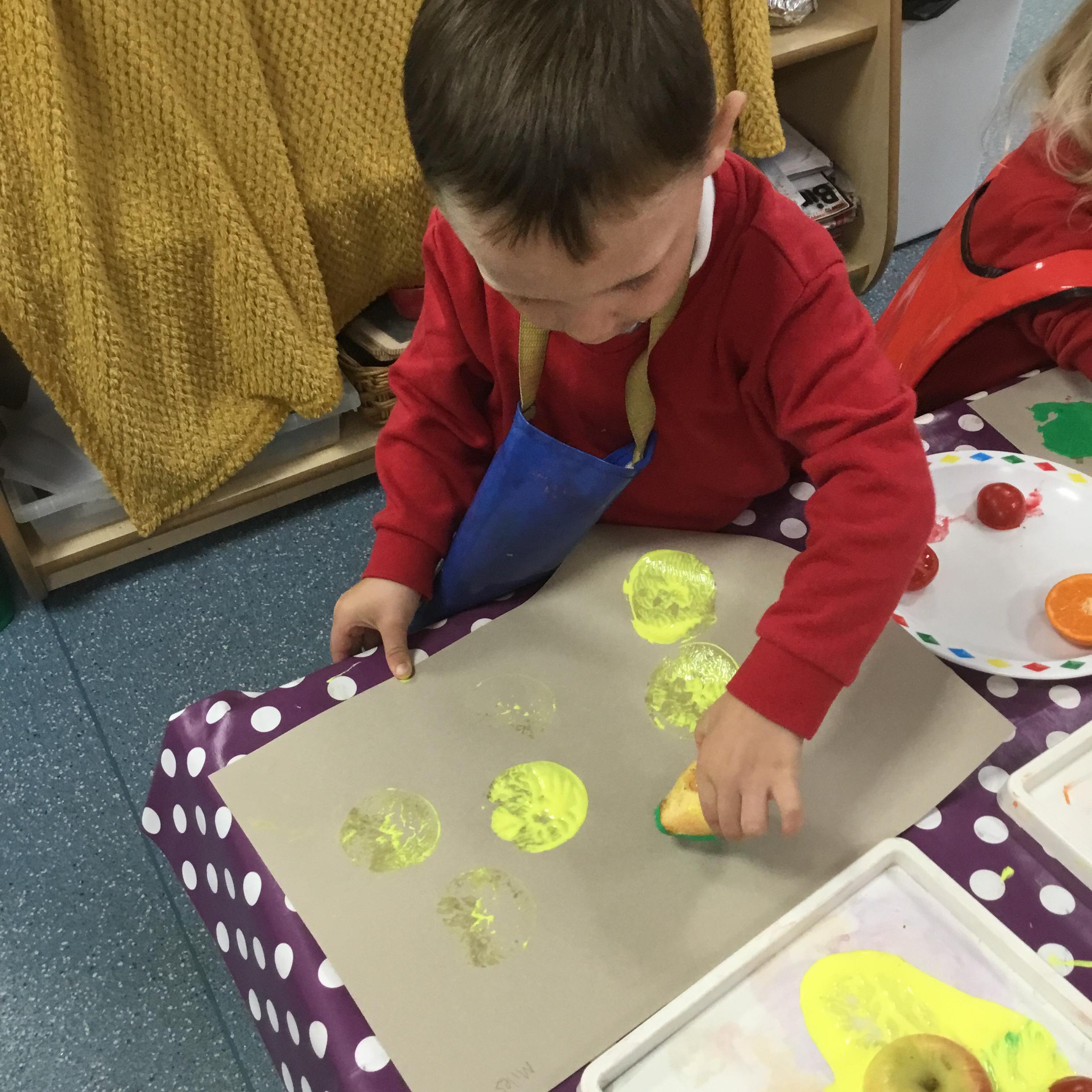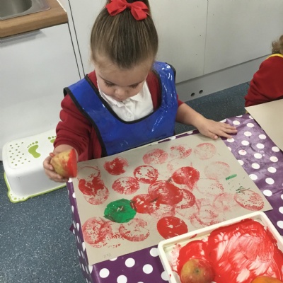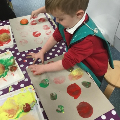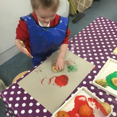 The children have been learning about ‘Harvest’ in Nursery and then they enjoyed printing pictures with some fruits and vegetables.
