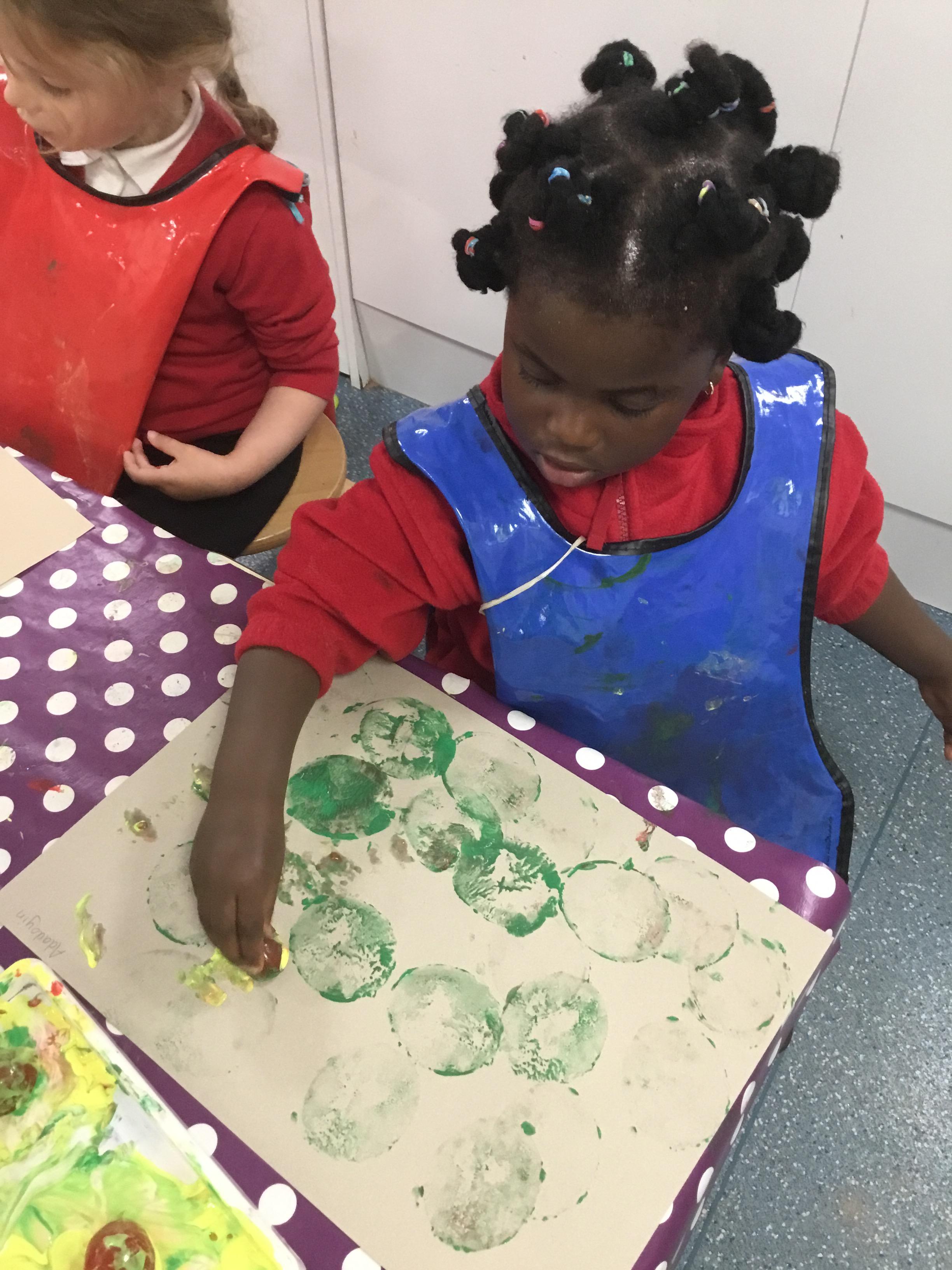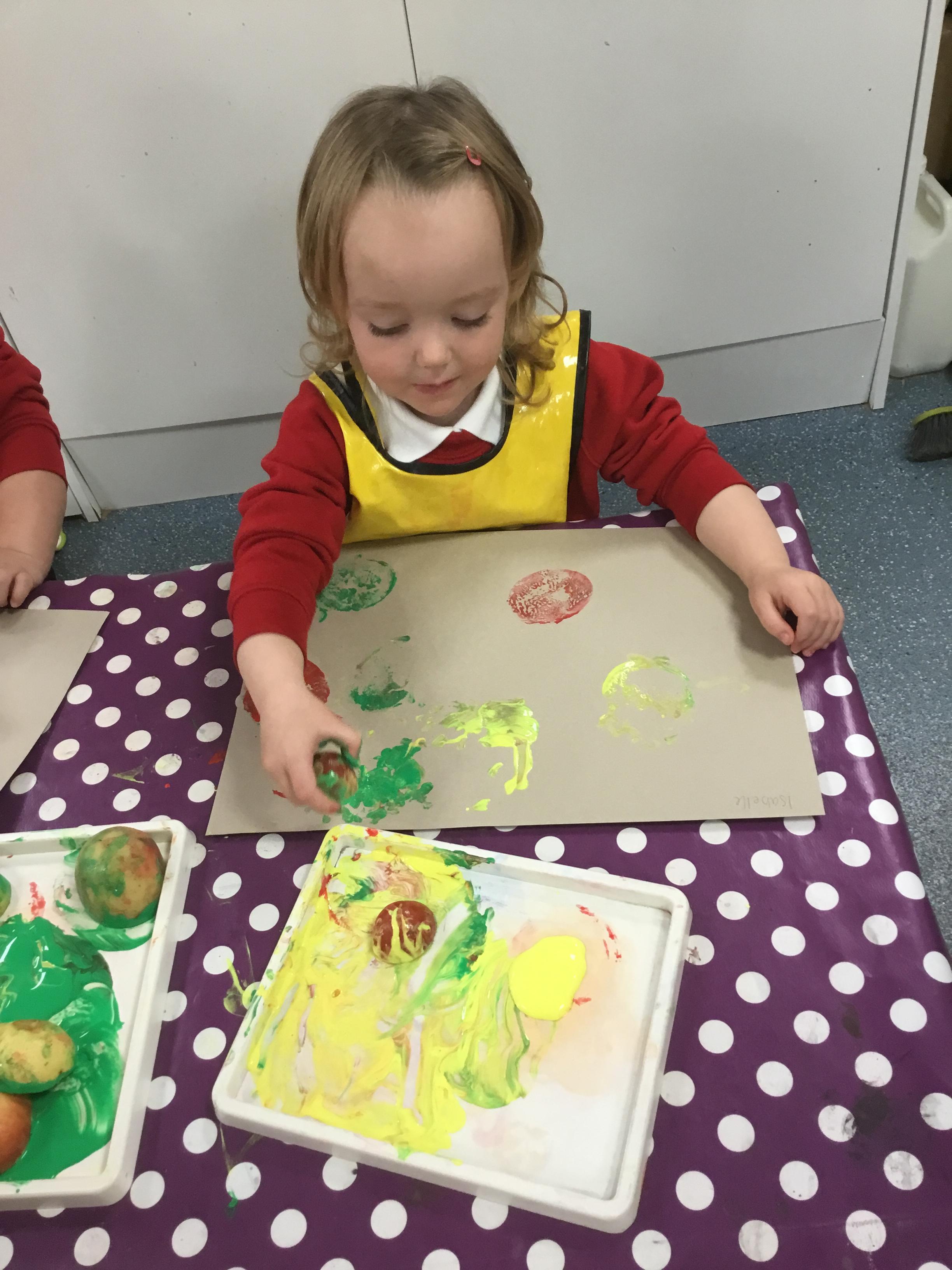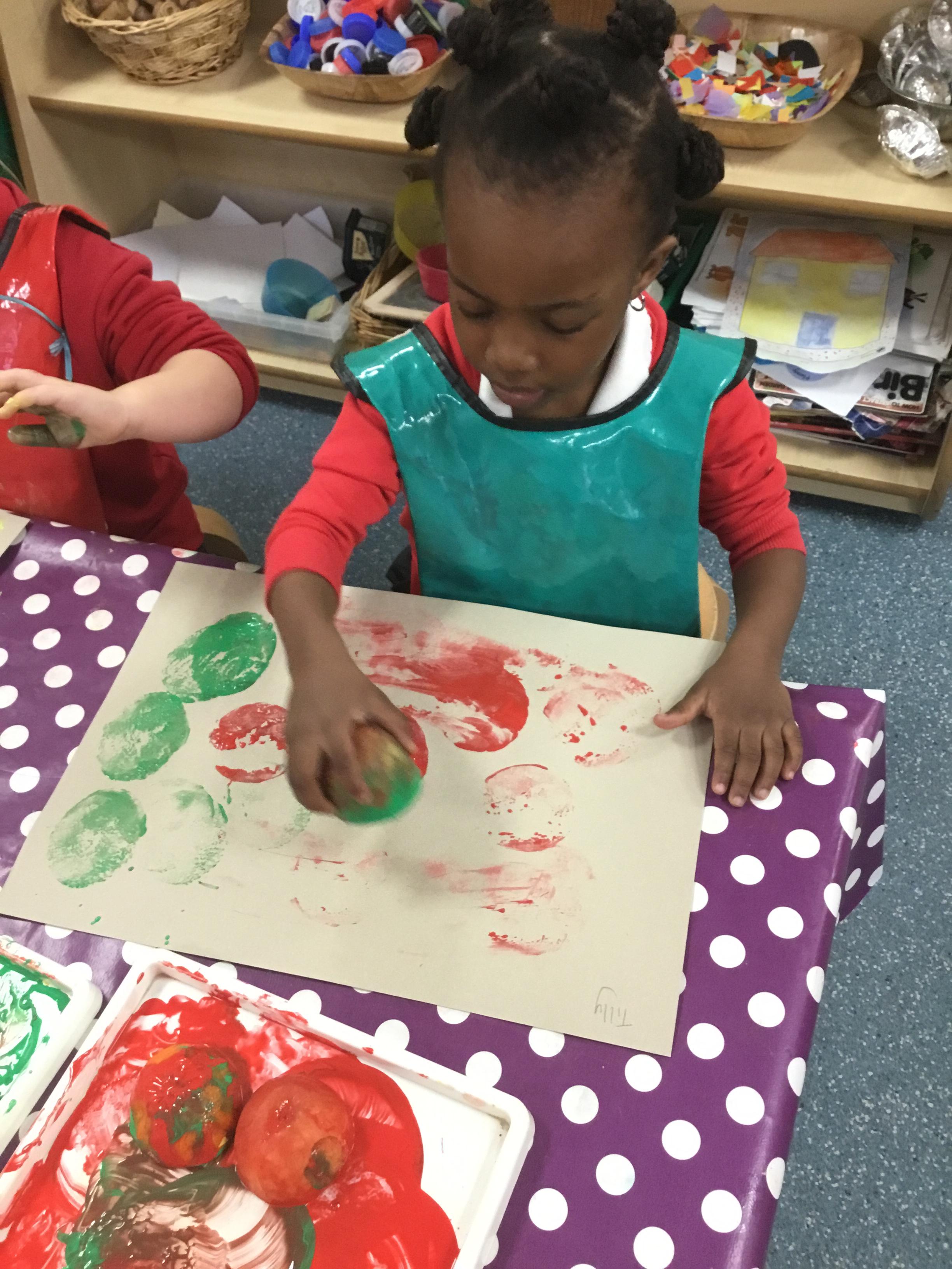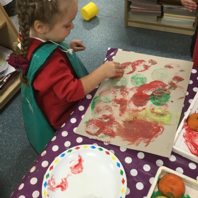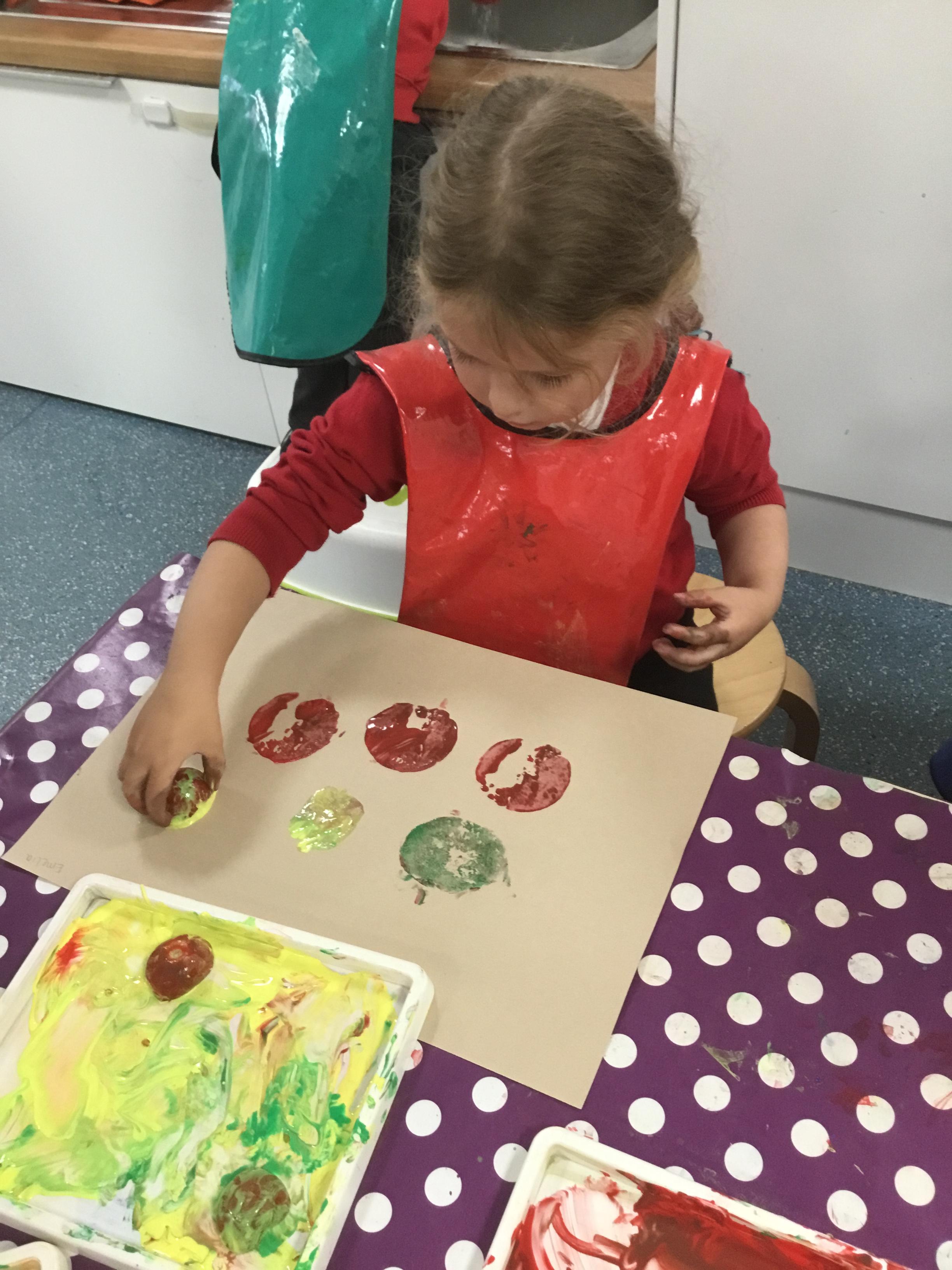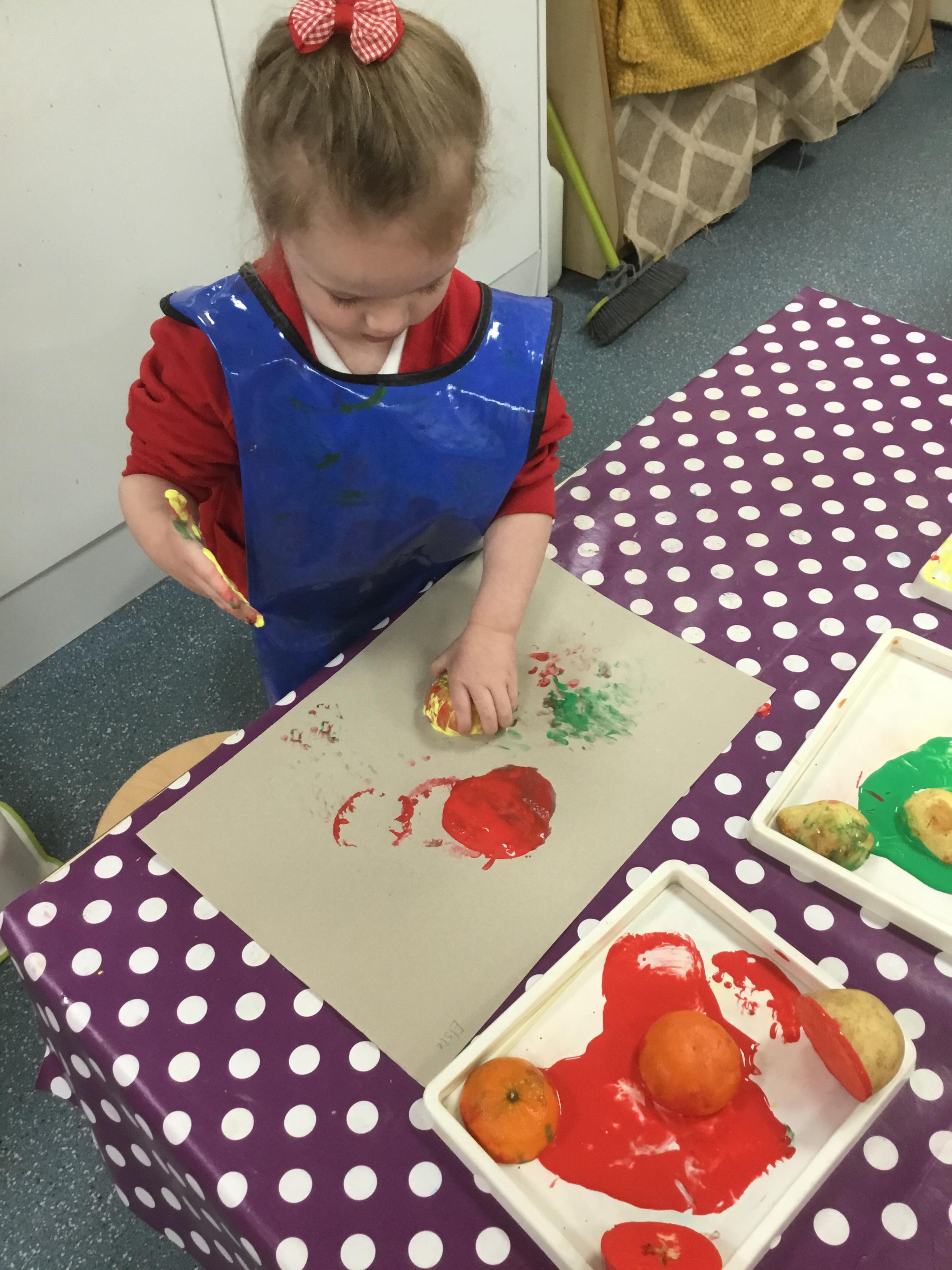 The children have been learning about ‘Harvest’ in Nursery and then they enjoyed printing pictures with some fruits and vegetables.