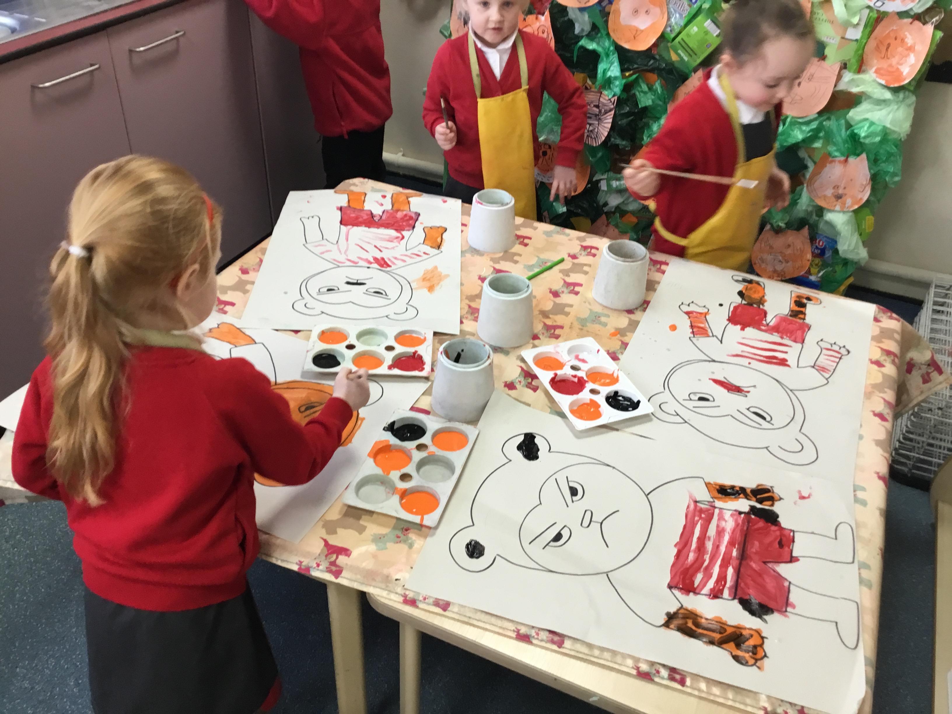 As part of English and Art week we studied the painting 'The Tiger in a Storn or Surprised' by Henri Rousseau. We took inspiration from the jungle and created our own jungle scene using recycled material. We then painted our own tiger heads and added more detail with black pens. In drawing club our code word allowed us to imagine what animal the tiger could be chasing. We had lots of discussion about what we could see in the painting and where the tiger might be going. The painting inspired to make our own tiger tails and masks in the classroom.