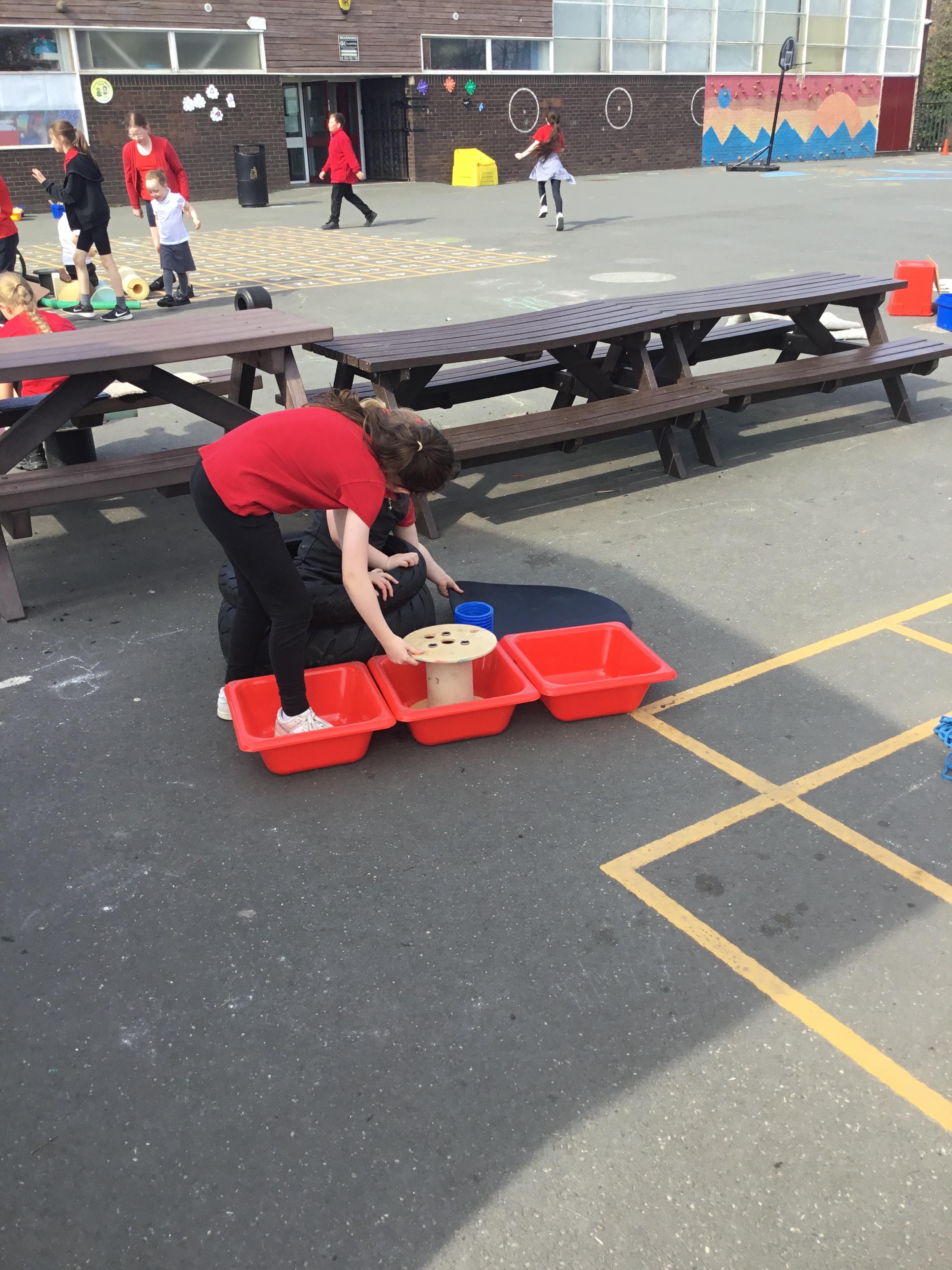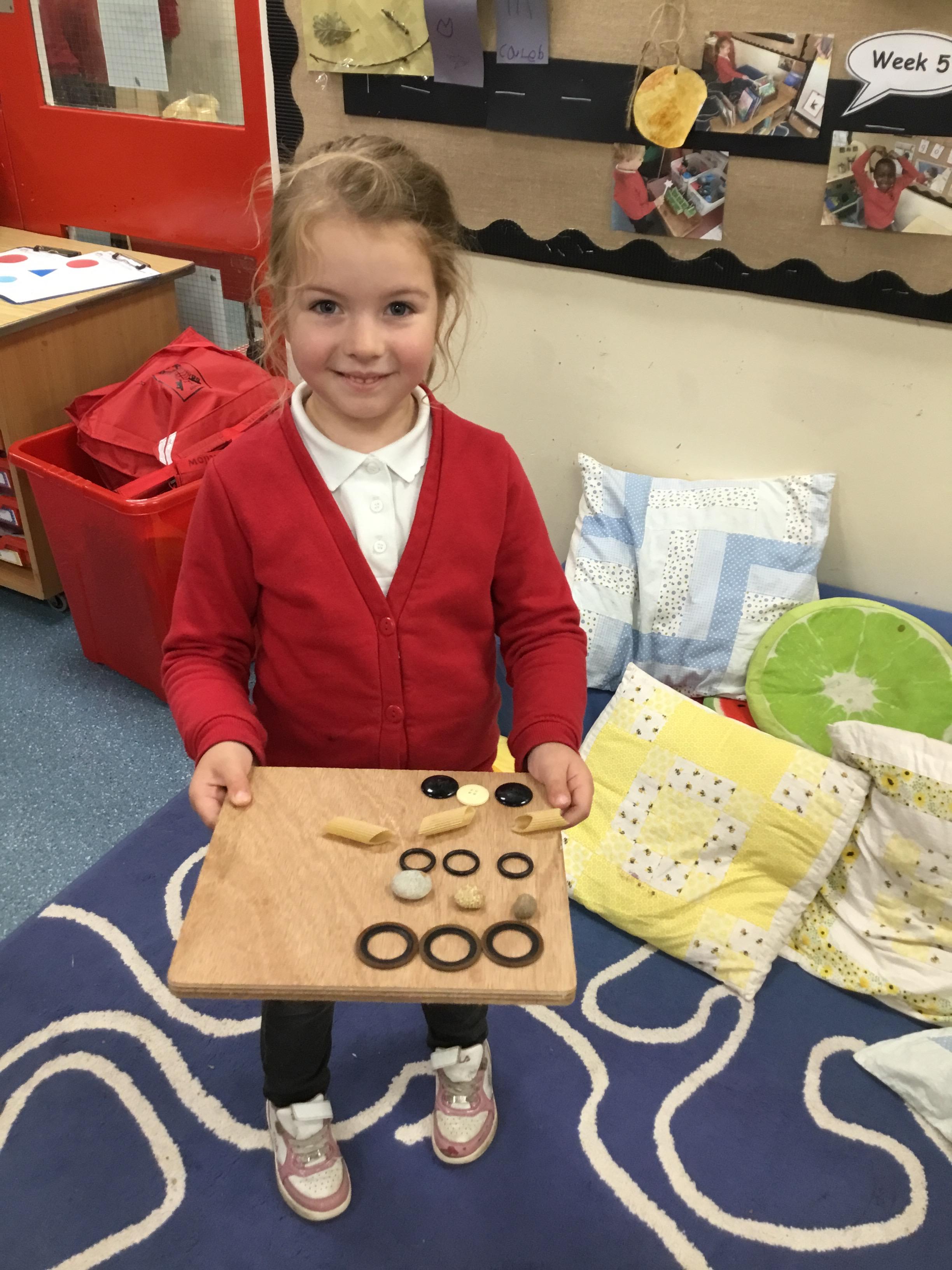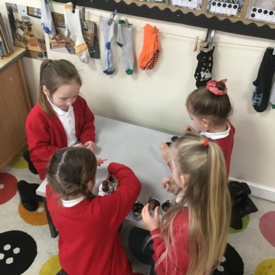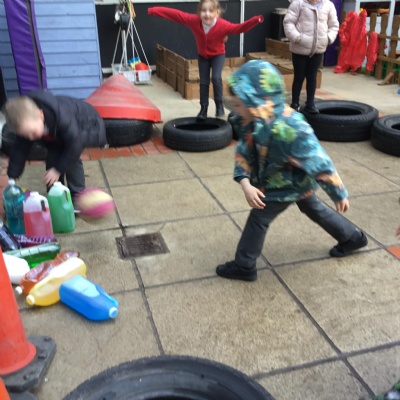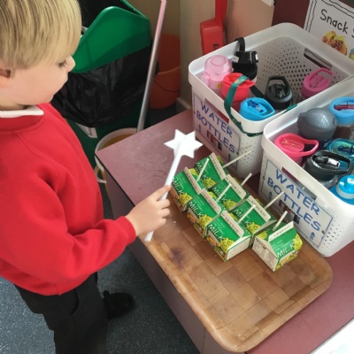 Outside we got creativity recycling plastic bottles to make our own skittles. In maths we started looking at 5 and what is 1 more, 2 more and what pattern we notice as the numbers get bigger, we used a tens frame to support this.