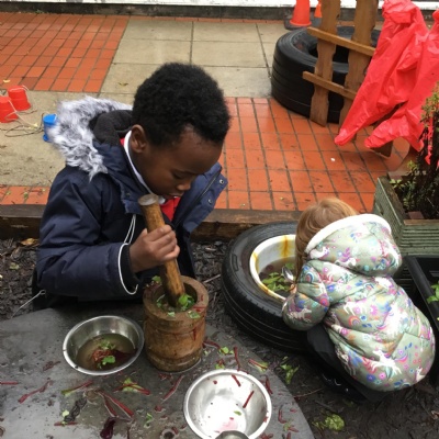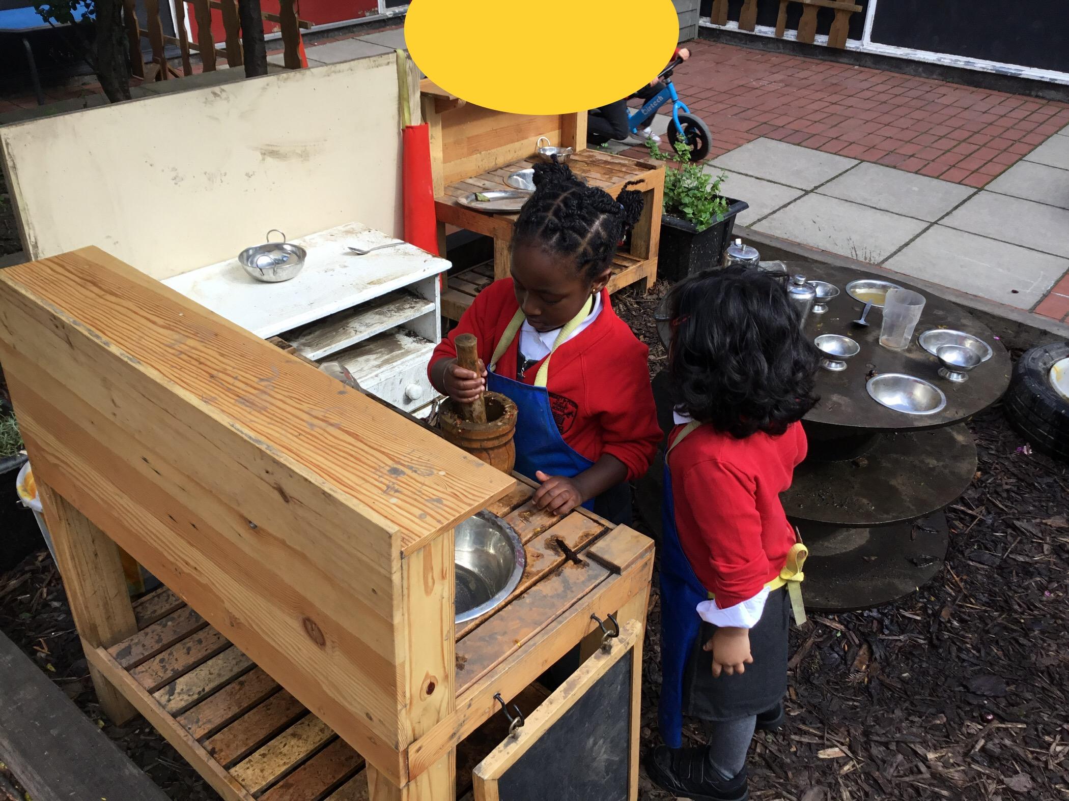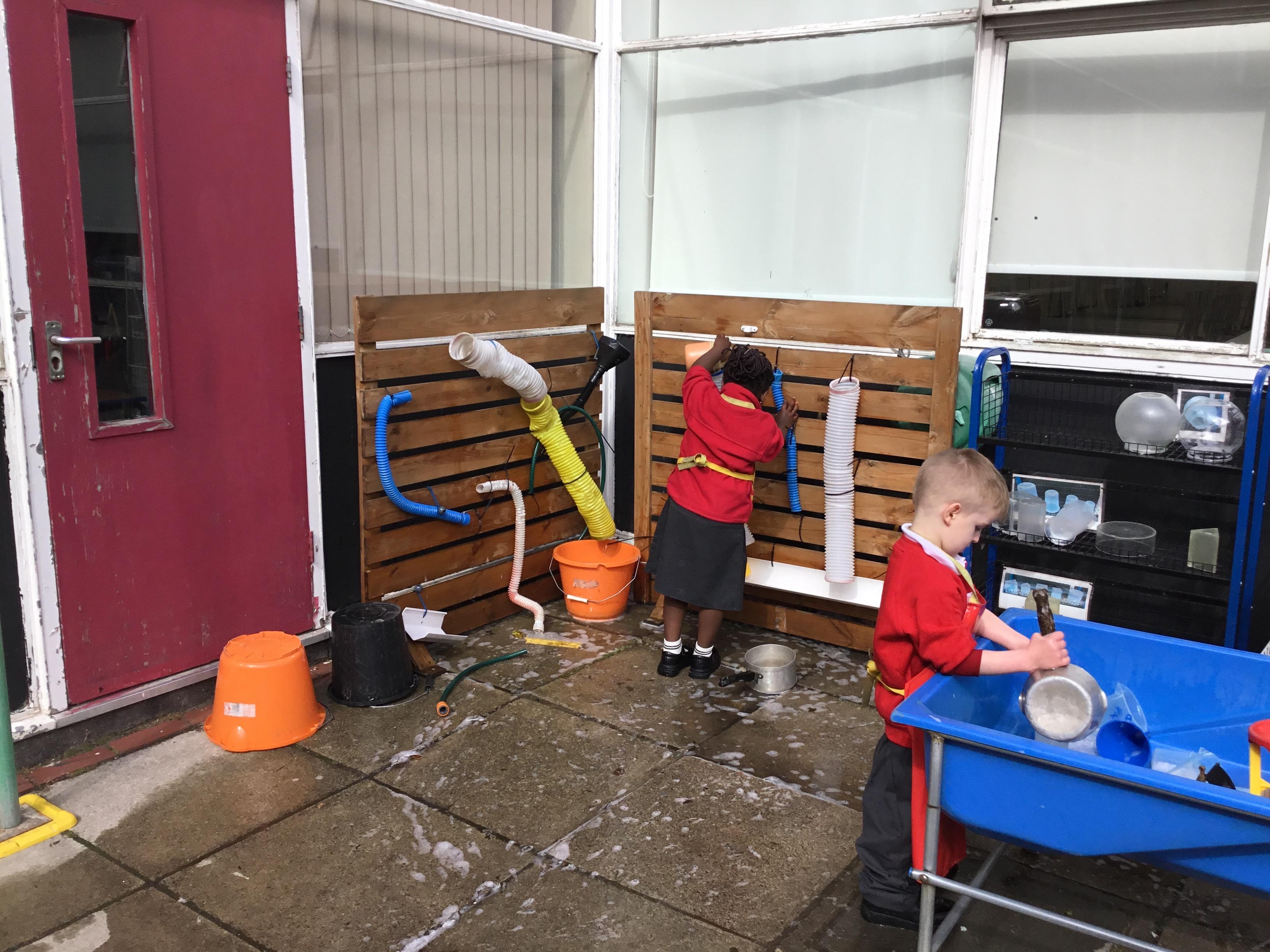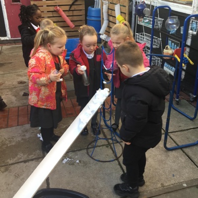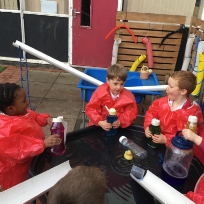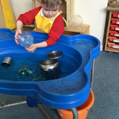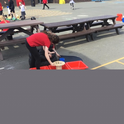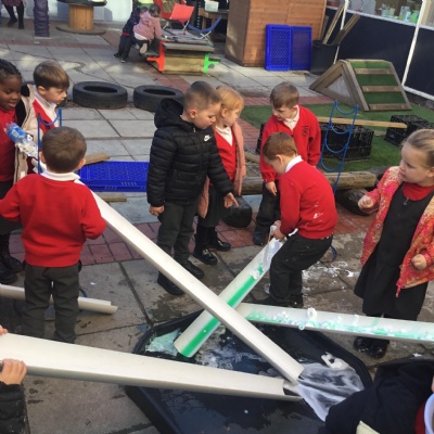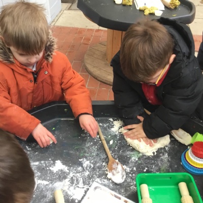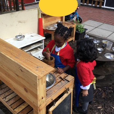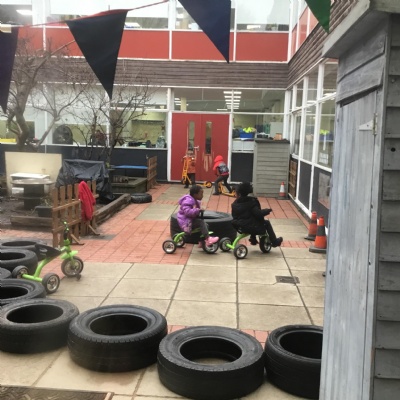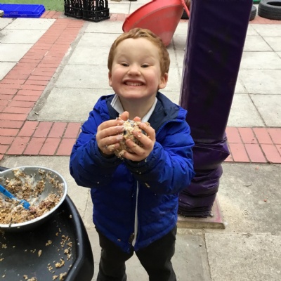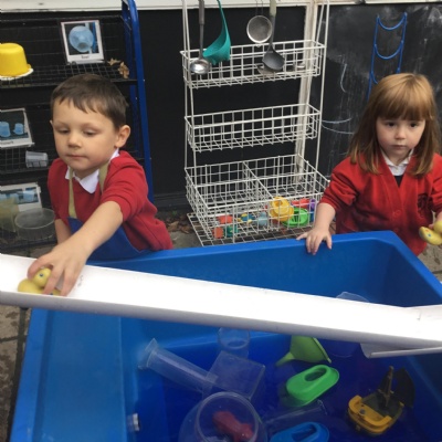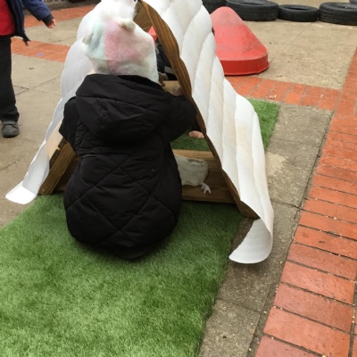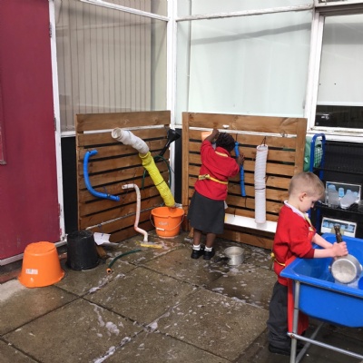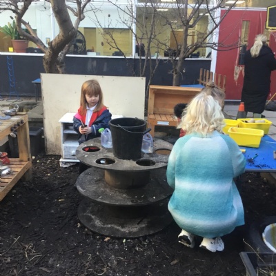 We aim to get outside no matter the weather. We have been developing our gross motor skills through cycling, climbing and balancing. Our mud kitchen provokes great conversations, turn taking and develops the children’s imagination. Our water area extends their maths knowledge looking at capacity and volume.