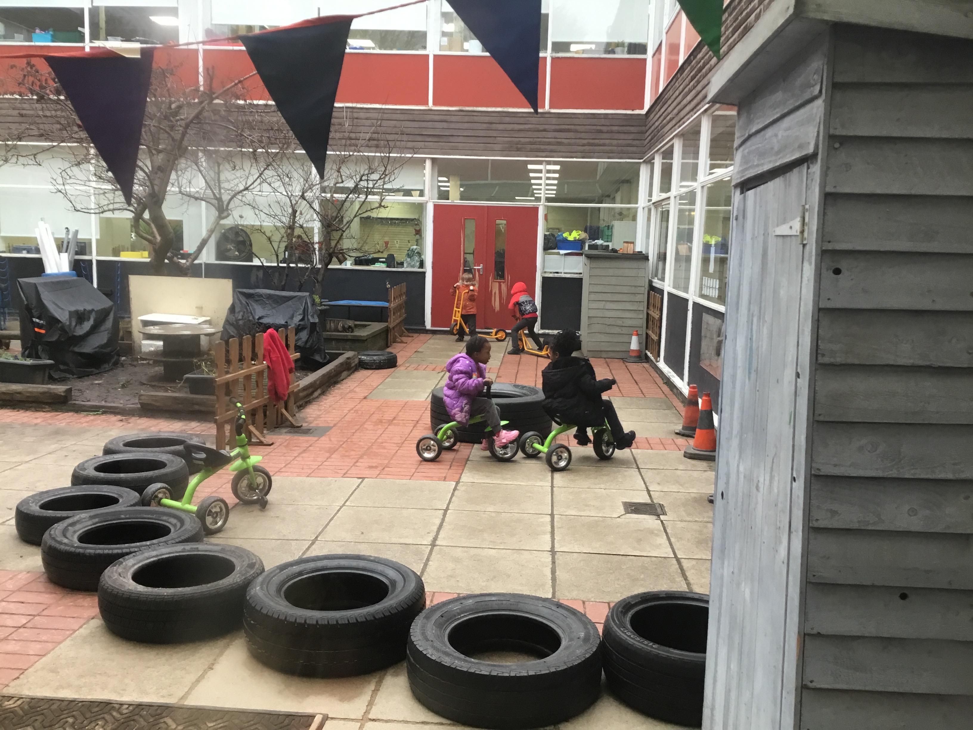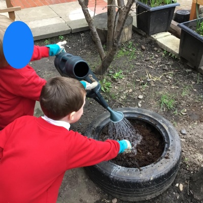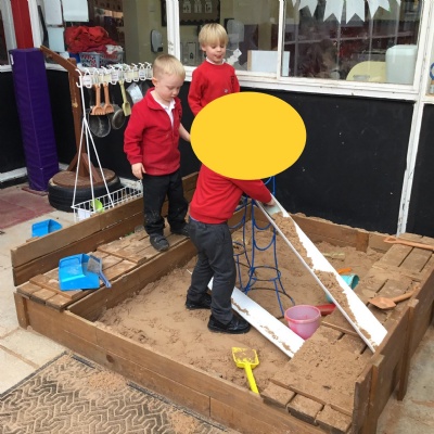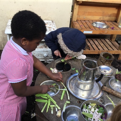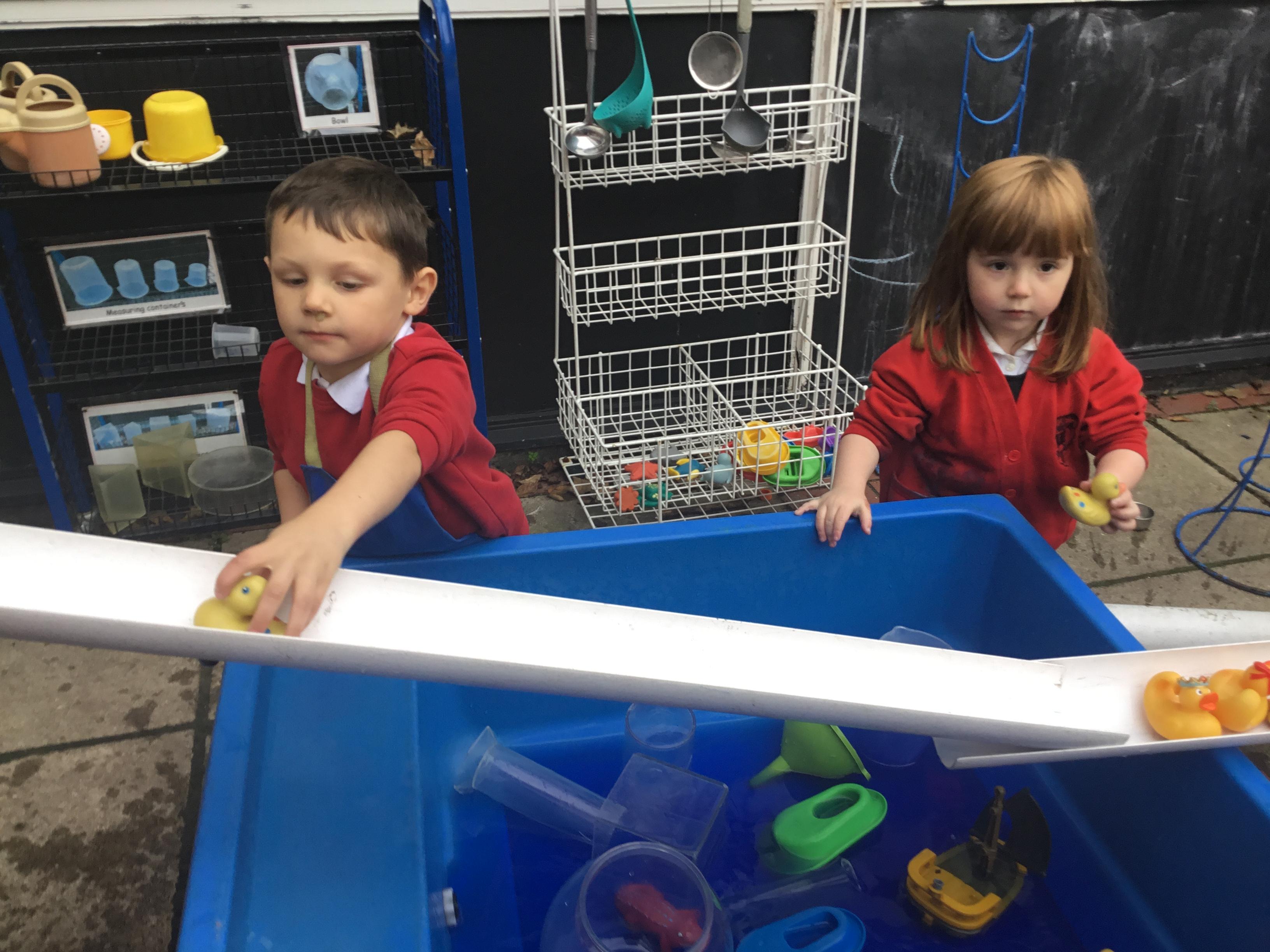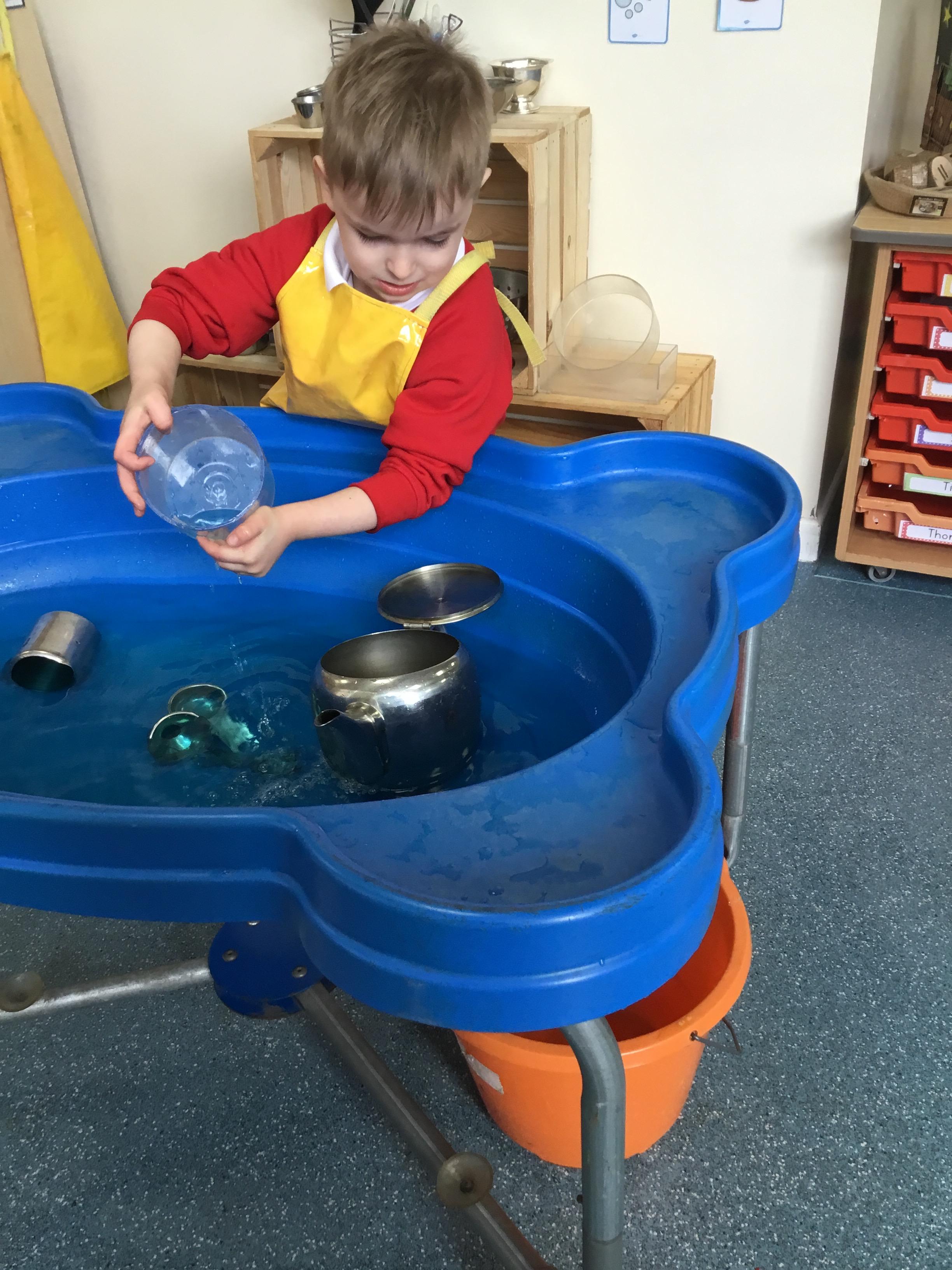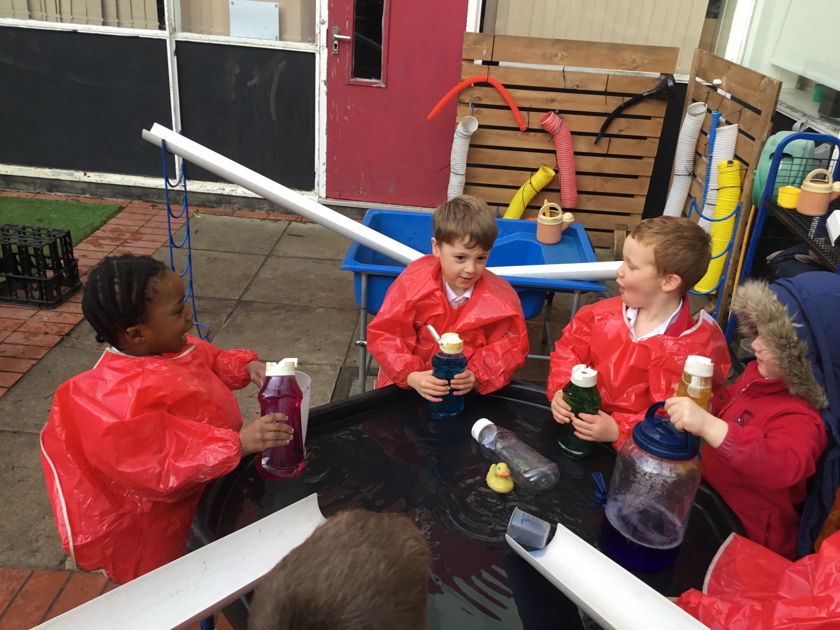 We aim to get outside no matter the weather. We have been developing our gross motor skills through cycling, climbing and balancing. Our mud kitchen provokes great conversations, turn taking and develops the children’s imagination. Our water area extends their maths knowledge looking at capacity and volume.