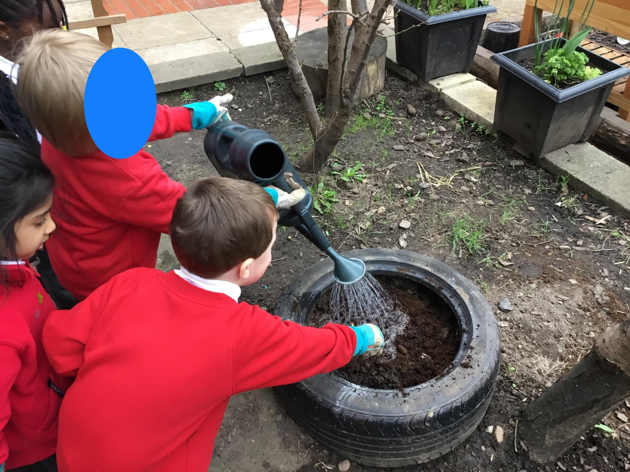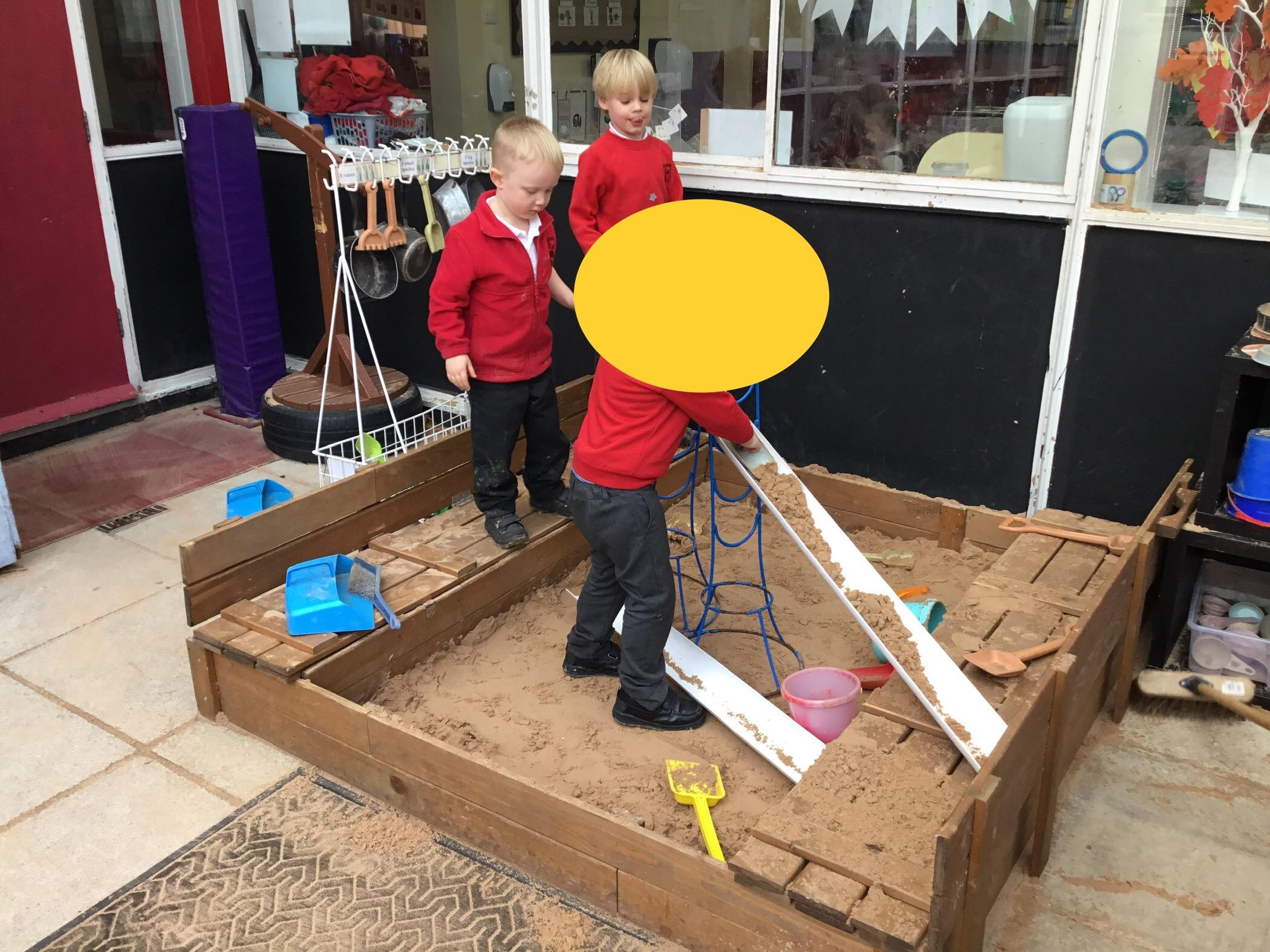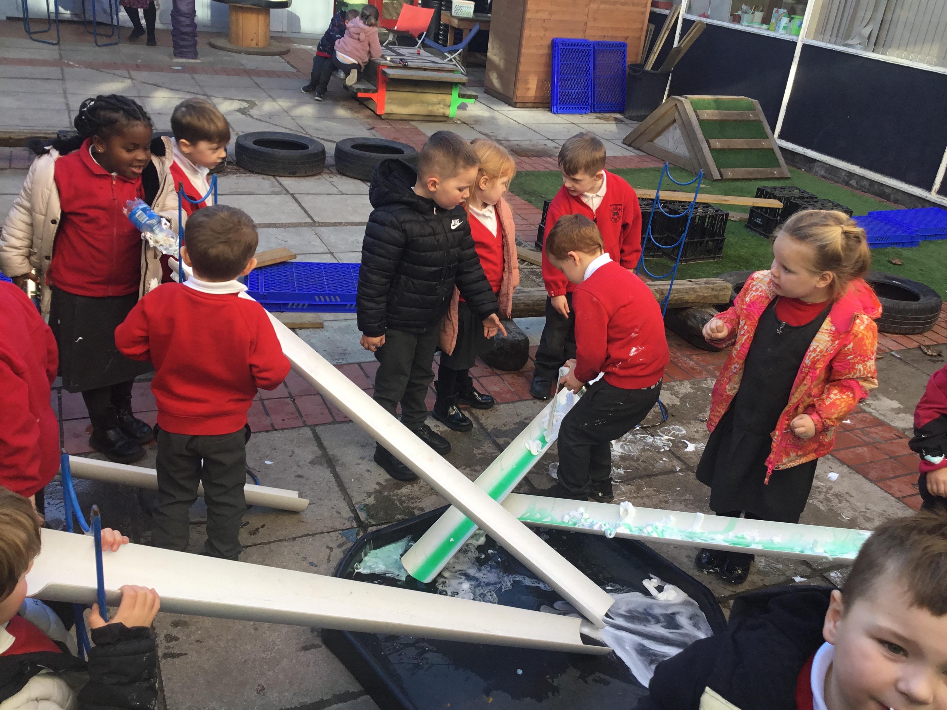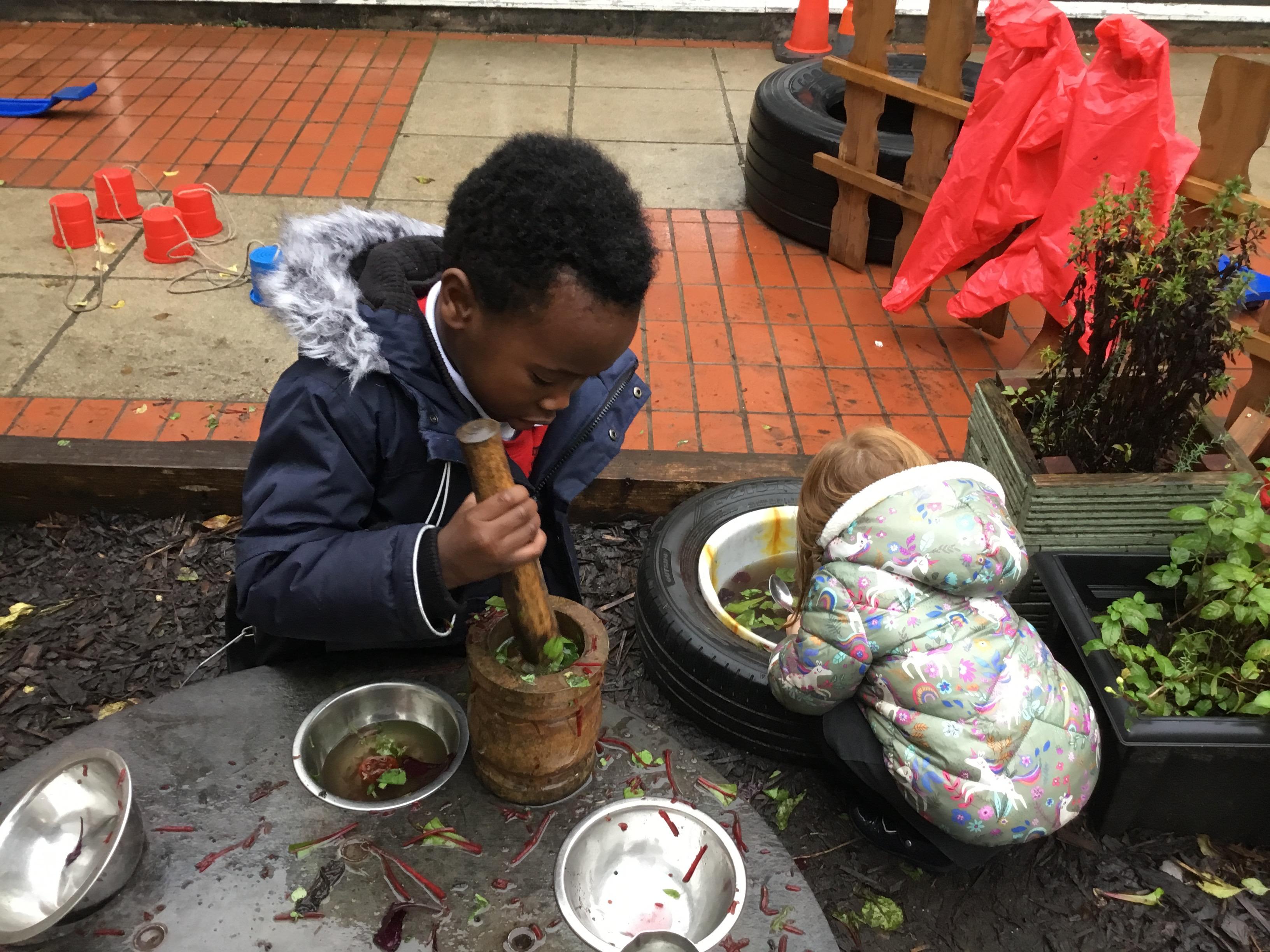 We aim to get outside no matter the weather. We have been developing our gross motor skills through cycling, climbing and balancing. Our mud kitchen provokes great conversations, turn taking and develops the children’s imagination. Our water area extends their maths knowledge looking at capacity and volume.