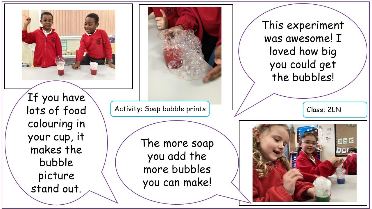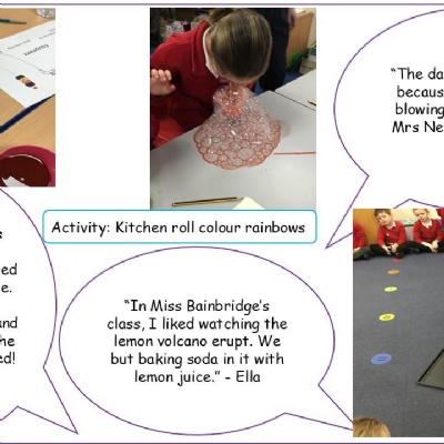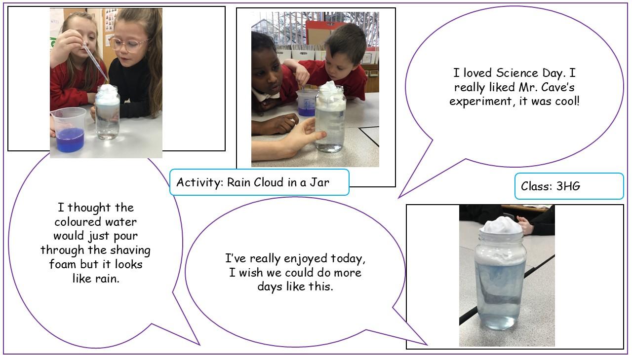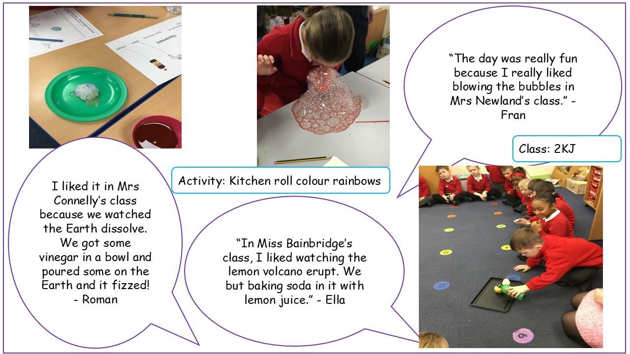 The children had a great day during 'Science Day' at the end of January. The children moved around school in class groups and got to take part in some exciting and engaging investigations such as soap bubble printing, self inflating balloons, lemon volcanoes and making rain clouds.